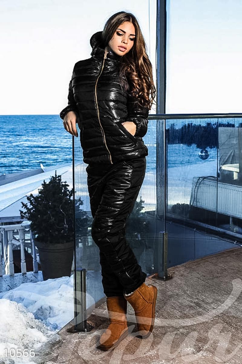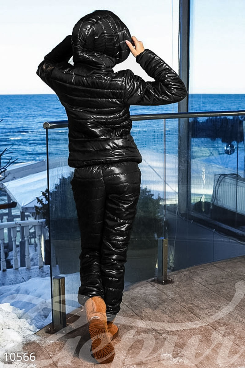 Теплый зимний костюм-двойка, выполненный из стеганой плащевой ткани: куртка на молнии со съемным капюшоном и карманами по бокам; брюки средней посадки с прорезными карманами и контрастными лампасами. .