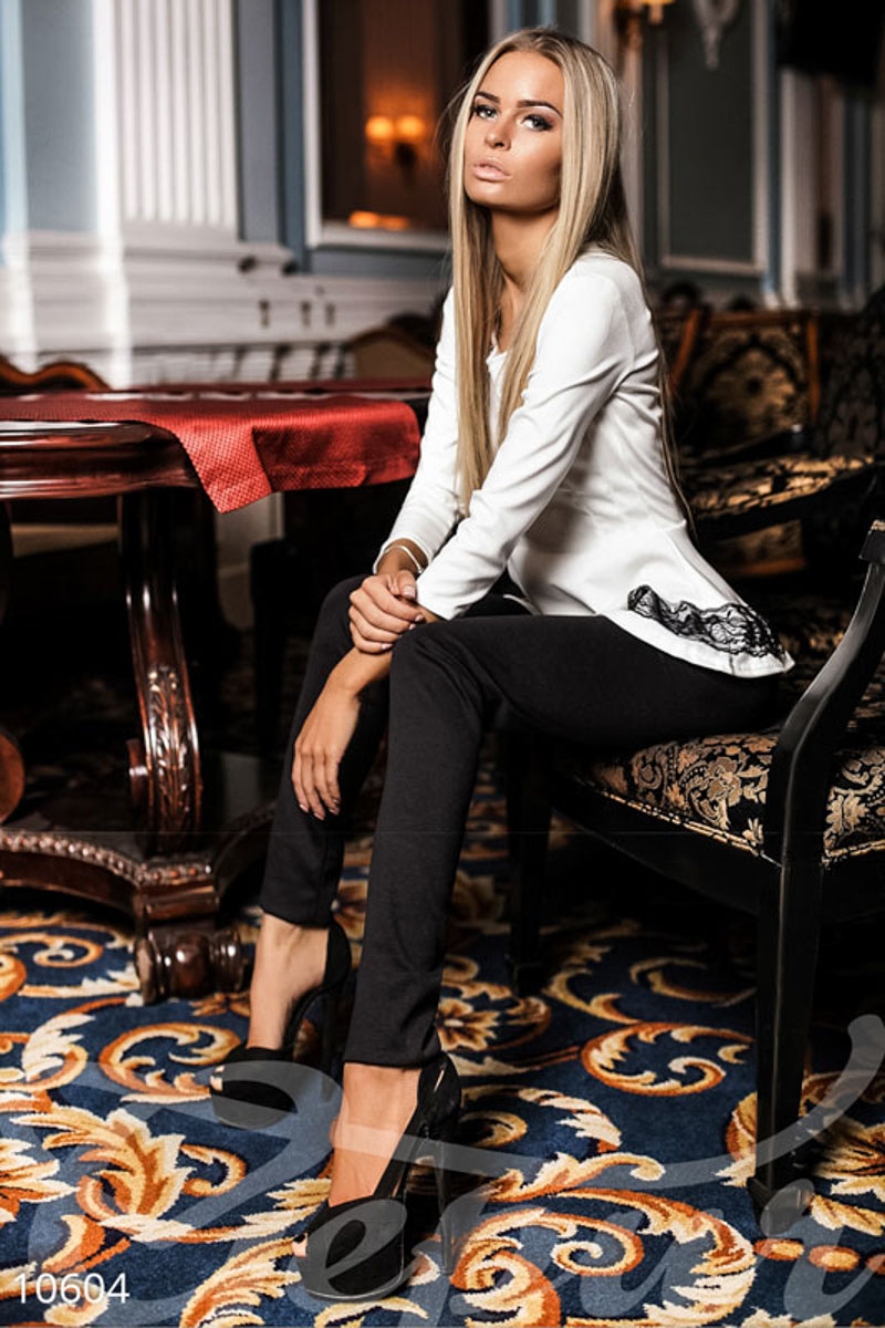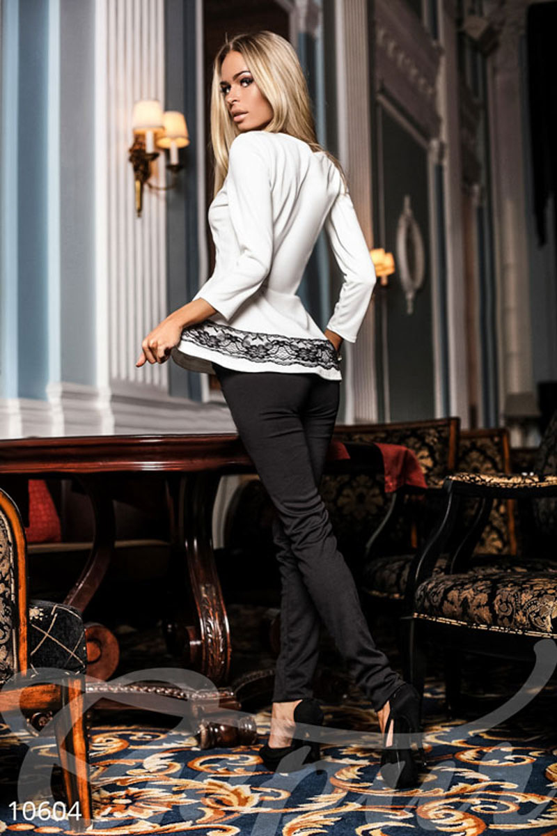 Двухцветный женский костюм, выполненный из мягкого трикотажного полотна: топ с длинным рукавом без манжет и пришивной баской, украшенной контрастным кружевом, облегающие брюки средней посадки с эластичным поясом.