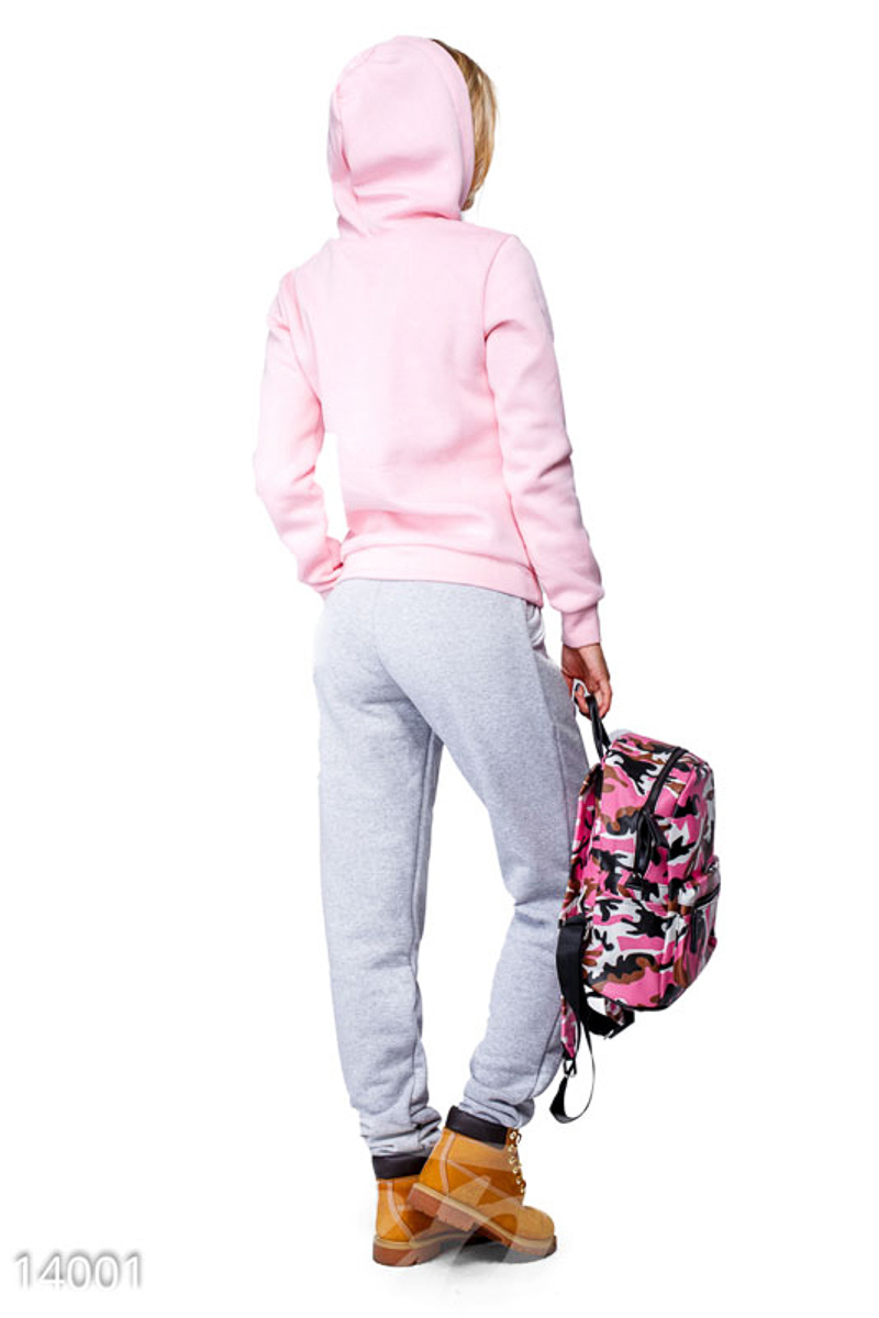 Удобный спортивный костюм для активного отдыха или прогулки с друзьями. Батник с манжетами на рукавах и капюшоном украшен накатом "крылья", Брюки с поясом на резинке и с карманами по бокам также украшены накатом в виде крыльев. Такой стильный и универсальный костюм должен быть в гардеробе у каждой девушки.