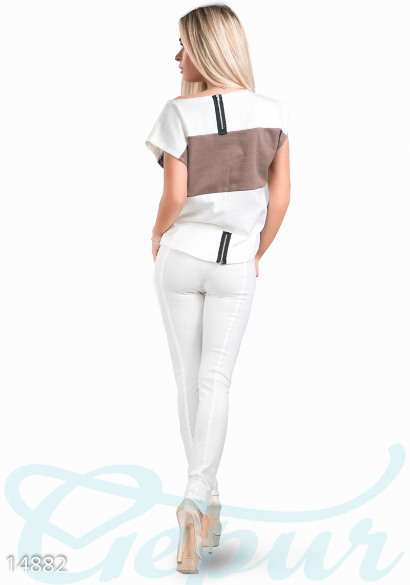 Стильный и очень удобный костюм - настоящая находка для осени или весны. Объемная кофточка без рукавов с ассиметричным низом - спинка немного длиннее и оформлена полукругом. Сзади расположены декоративные змейки. Леггинсы с поясом на резинке с вертикальными вставками, которые визуально стройнят и удлиняют ноги.