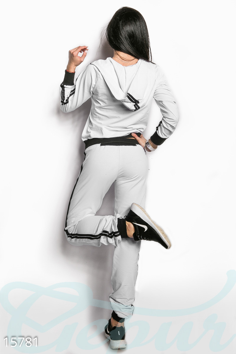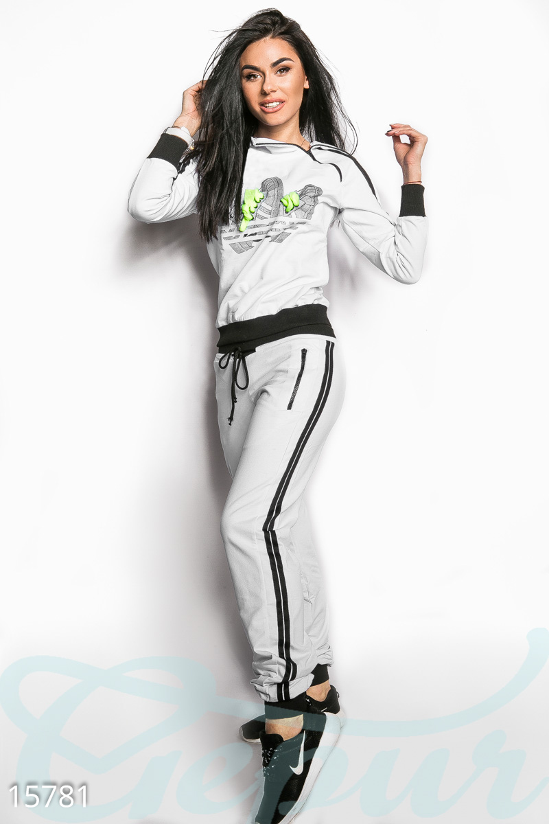 Костюм в стиле casual с принтом "кеды". Его можно надеть как на спортивную тренировку, так и отправляясь по своим повседневным делам. Очень удобная и стильная модель. Материал: двунить Застежка: молния спереди Длина: кофта - 60 см, длина рукава по внутреннему шву - 48 см, штаны - 104 Цвет: белый, вставки - черный