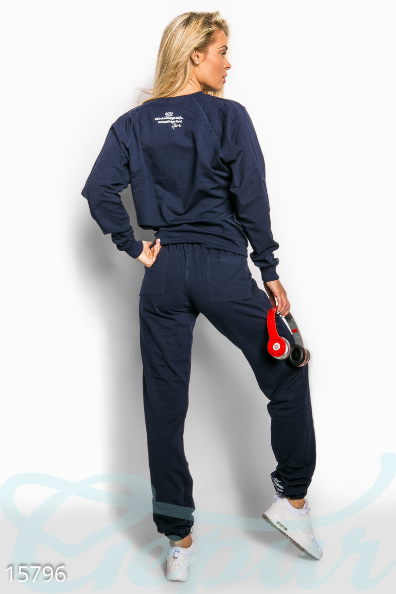 Спортивный костюм украшен накатом "ONE LOVE". Рукава на манжетах с рибаной. Брюки с поясом на резинке и с манжетами украшены стильным накатом, который дополняет кофту. Сзади на брюках есть два кармана. Это отличный вариант для прогулки или занятий спортом.