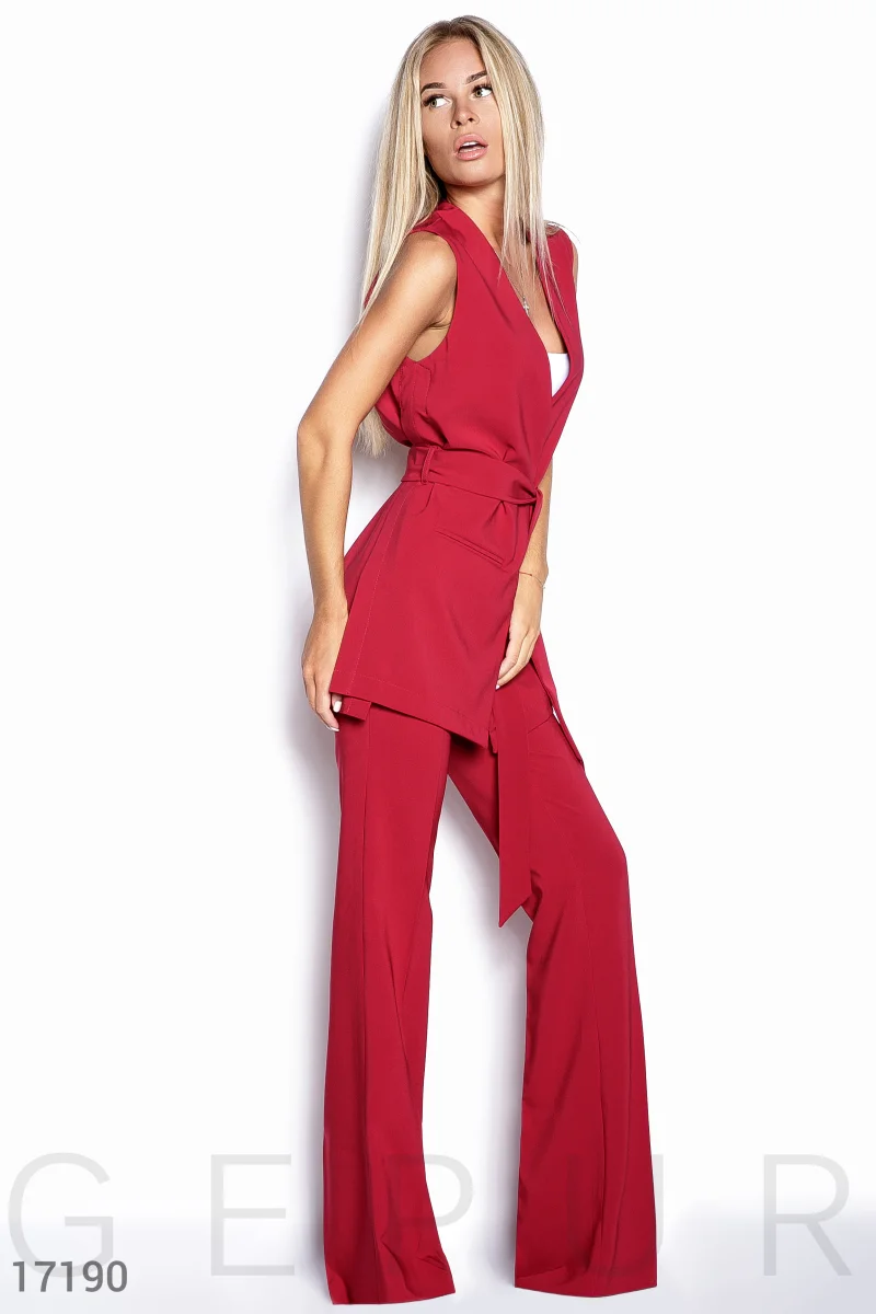 Элегантный костюм от дизайнеров Gepur, выполненный из струящейся костюмной ткани: удлиненный жилет с двумя прорезными карманами, разрезами по бокам и съемным поясом в петлях-шлевках; брюки-клеш с высокой посадкой.
