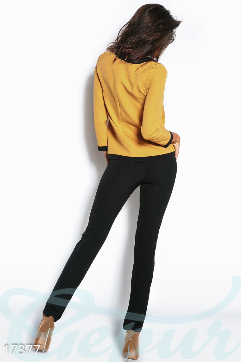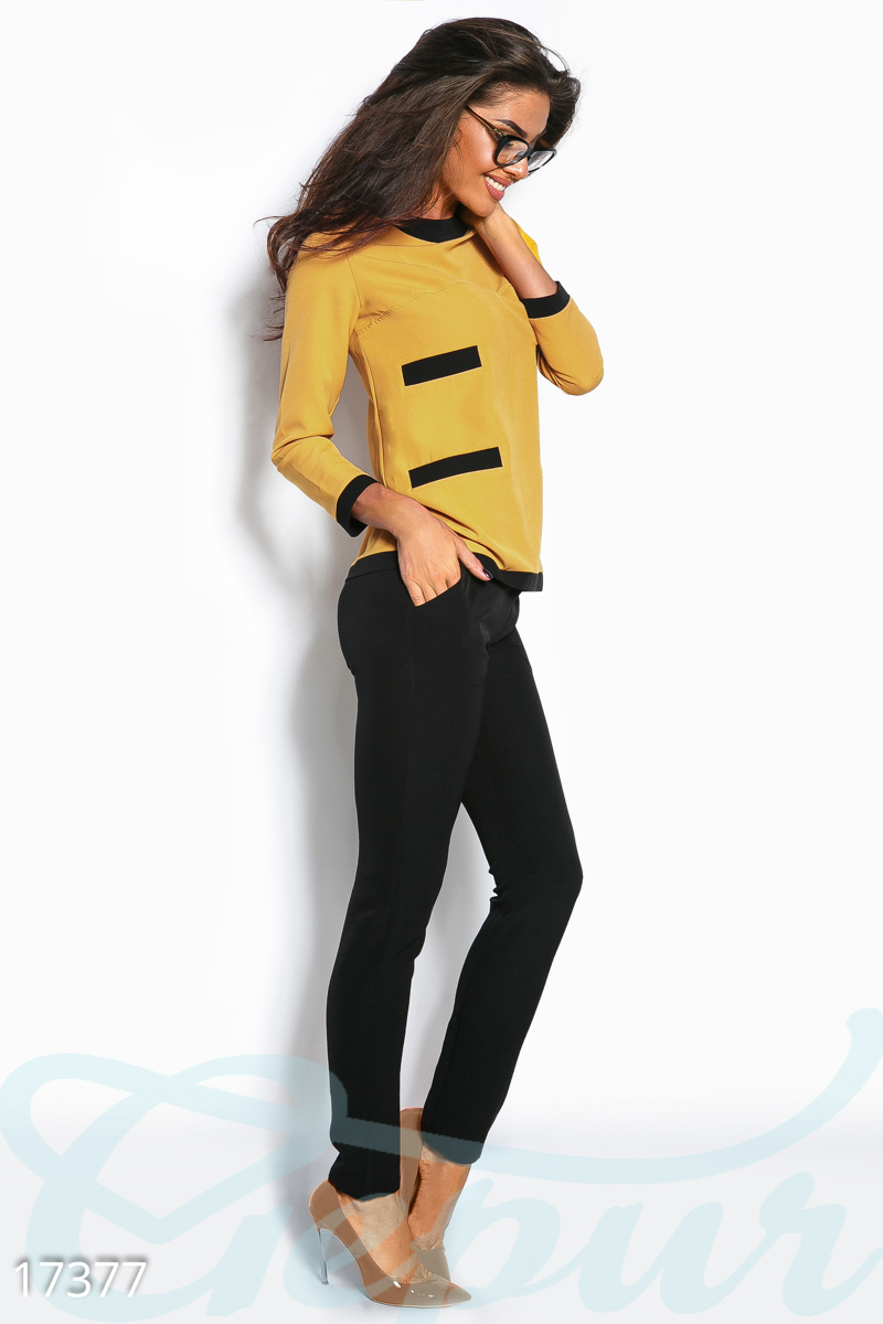 Стильный женский костюм, выполненный из двухцветной костюмной ткани: лаконичная блуза с контрастным кантом и зауженным рукавом ¾, облегающие брюки средней посадки с двумя прорезными карманами по бокам. ,,