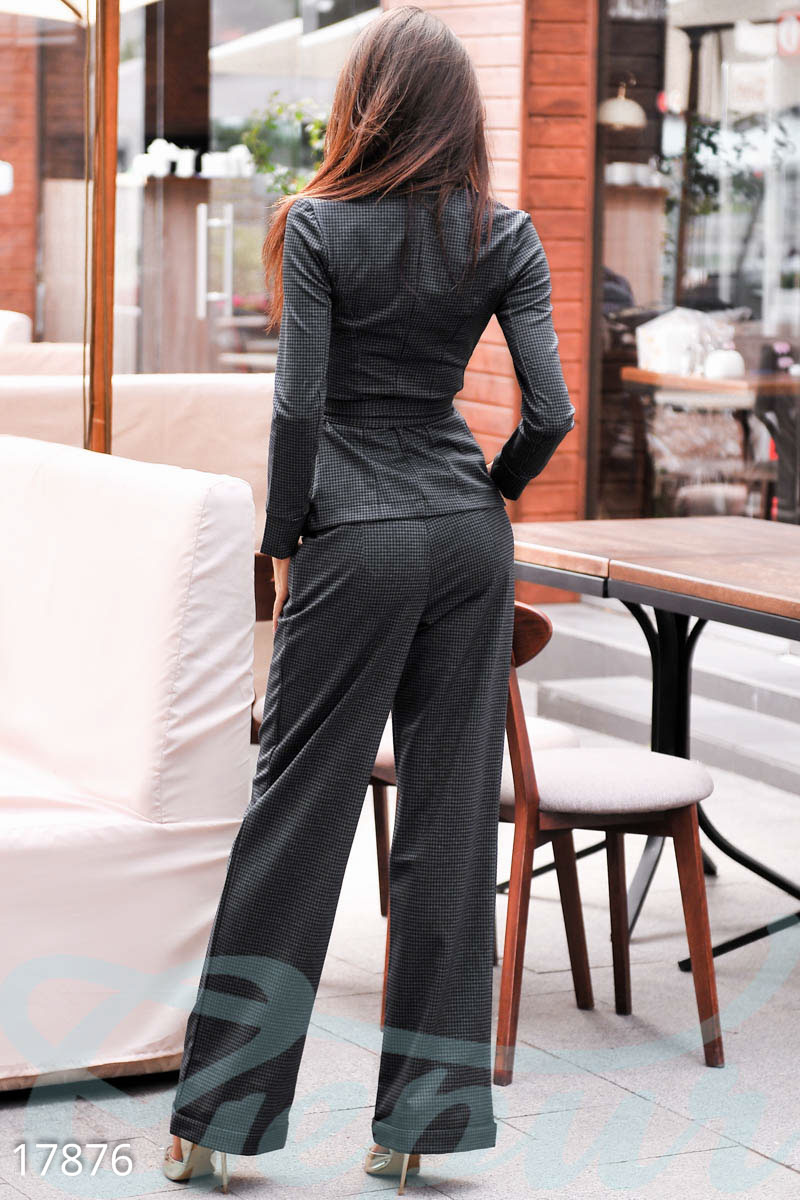 Классика – вот, что спасет гардероб от стремительных модных течений. Такой брючный костюм станет выгодной инвестицией в шкафчик и поможет иметь готовый look на все времена. Среди главных особенностей комплекта: брюки широкого кроя и блейзер на пуговицах. Брюки имеют фиксированные подвороты на штанинах, два передних «косых» кармана и втачной пояс с петлями-шлевками. На блейзере предусмотрены манжеты без застежек, асимметричный крой с треугольными бортами спереди и два передних прорезных кармана. Дополняет комплект съемный пояс и мелкий принт в клеточку «виши».