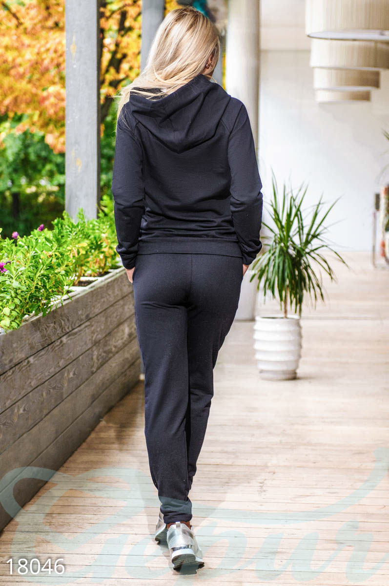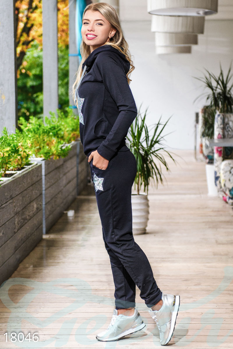 Спорт или гламур? Зачем выбирать, если есть этот спортивный костюм! Изготовленный в стиле sport chic, этот комплект имеет удобный спортивный фасон, который разбавлен яркой деталью. Среди главных особенностей комплекта: штаны на втачном поясе-резинке и кофта с капюшоном на шнурке. Костюм имеет широкие манжеты на штанинах и рукавах, а также по два кармана – на кофте и брюках. Дополняет комплект нашивка в форме звезды, которая изготовлена из золотистого перламутрового материала.