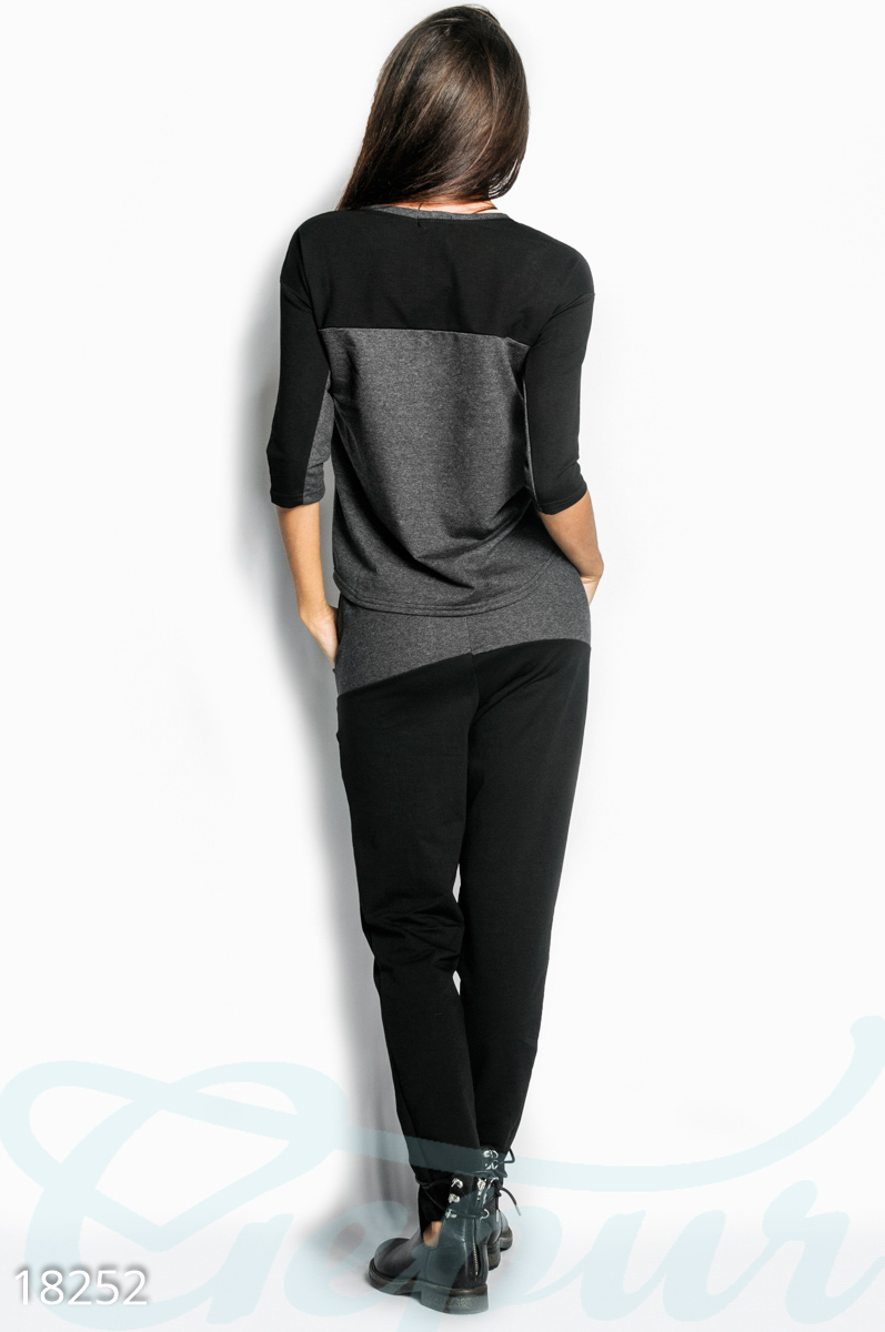 Двухцветный спортивный костюм, выполненный из плотного трикотажного полотна: реглан с облегающим рукавом ¾ и закругленным подолом, зауженные брюки средней посадки с двумя прорезными карманами по бокам.