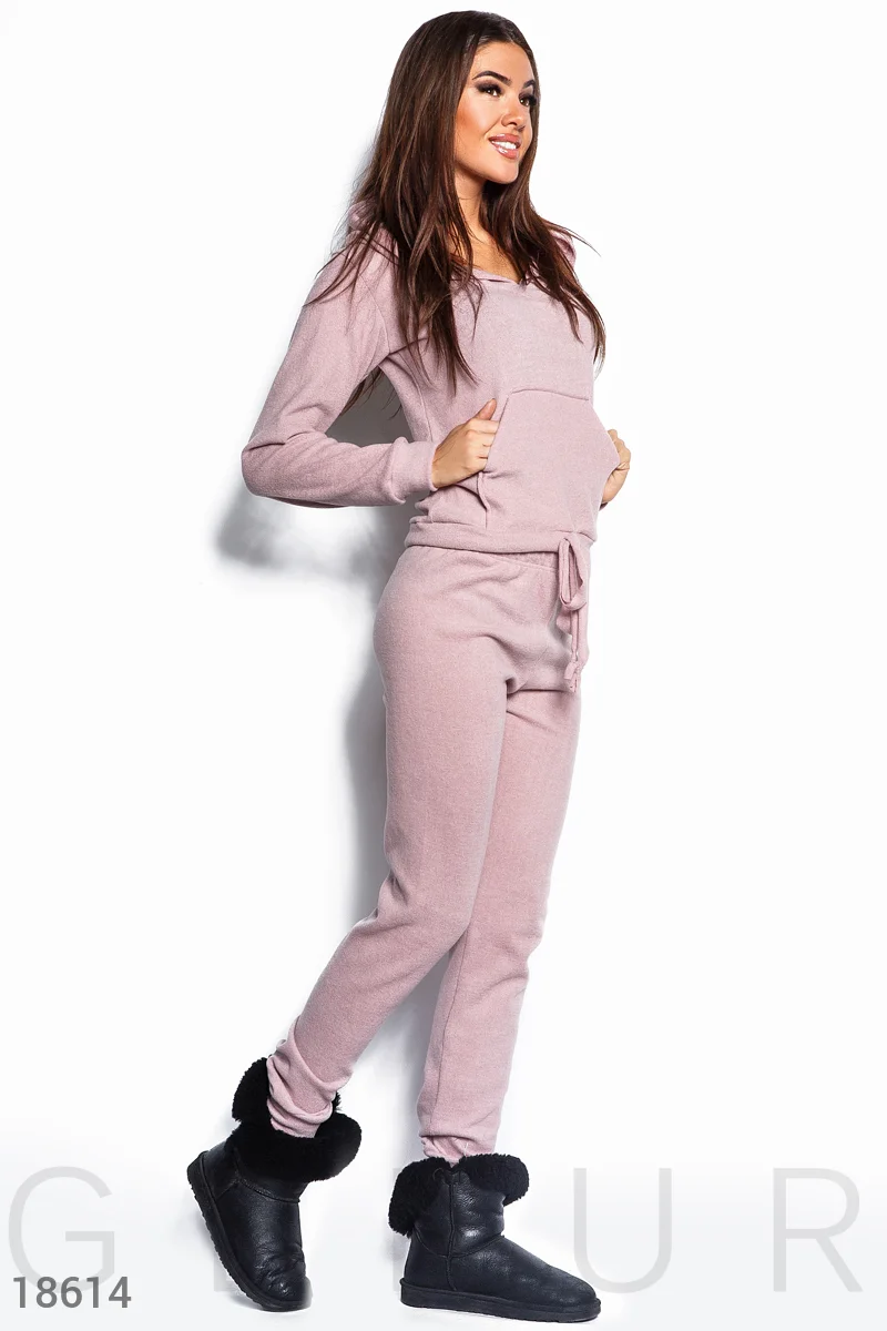 Комфортный спортивный костюм, выполненный из мягкого трикотажа: классическое худи с карманами-кенгуру, брюки средней посадки с манжетами и поясом с завязками. .