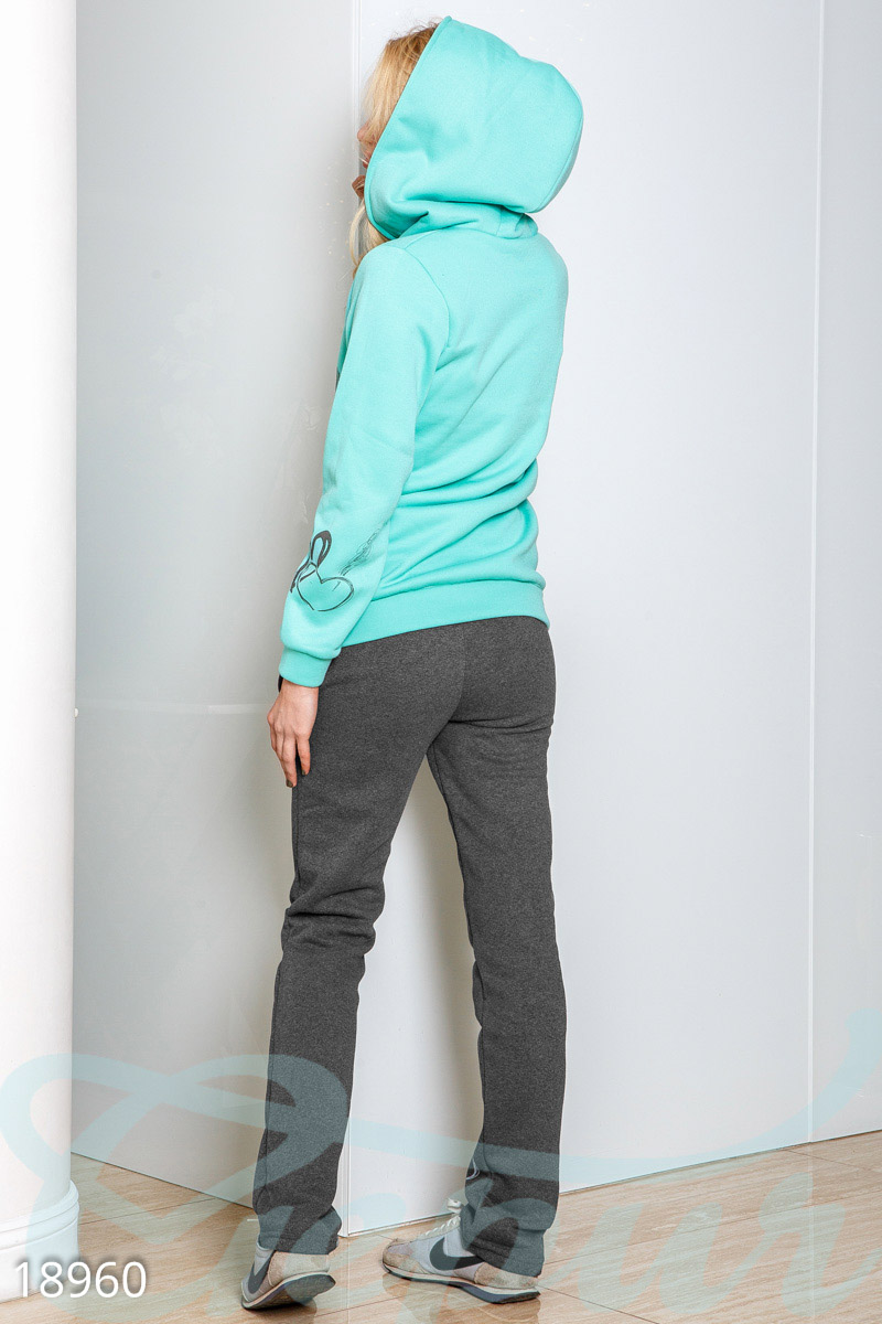 Костюм в стиле street style разнообразит ваш спортивный гардероб. Подарит настроение благодаря двухцветной расцветке. Главной изюминкой станет длинный капюшон и накат сердечками с мелкими блестками. Удержит штаны на месте втачная резинка, а согреет руки – два прорезных кармана. Дополнит спортивный look квадратный вырез внизу на кофте, который можно расстегнуть с помощью молний.
