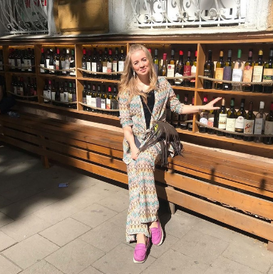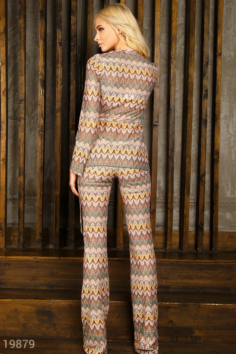 Уникальный костюм от дизайнеров Gepur, выполненный из легкой трикотажной вязки с цветными узорами: удлиненный жакет на запáх с глубоким v-образным вырезом и длинным рукавом без манжет, брюки-клеш с высокой посадкой. Коллекцию представила Алена Шишкова - 2-я Вице-мисс Россия 2012 и популярный Instagram-блоггер.