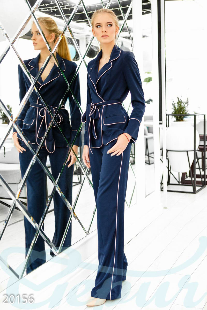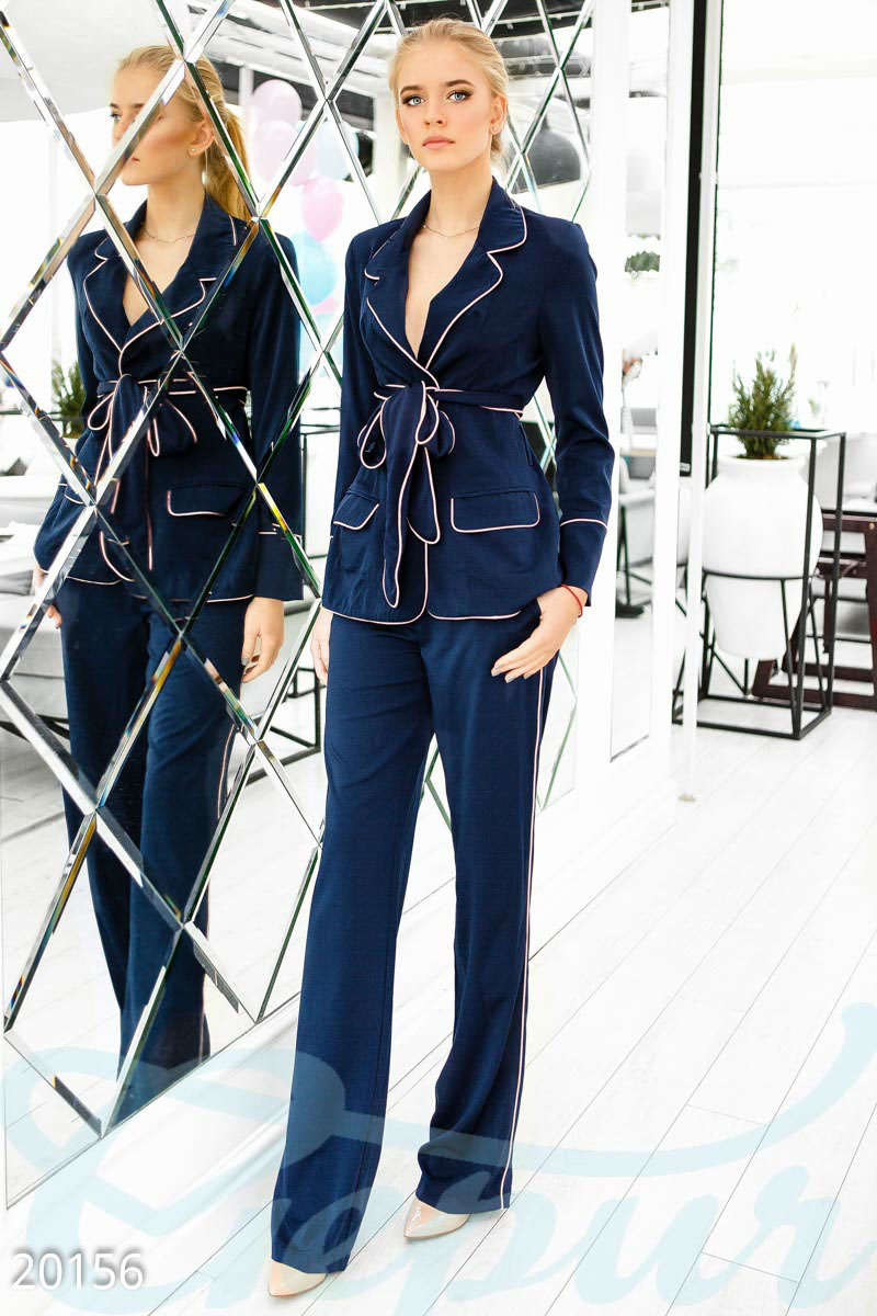 Брючный костюм из приятной легкой ткани. Комплект эксклюзивного кроя с брюками и пиджаком на запáх. Среди главных особенностей модели: небольшие подплечники, подклад на пиджаке и съемный пояс в петлях-шлевках. Дополняют модель несколько карманов: с клапанами на пиджаке и прорезные на брюках.
