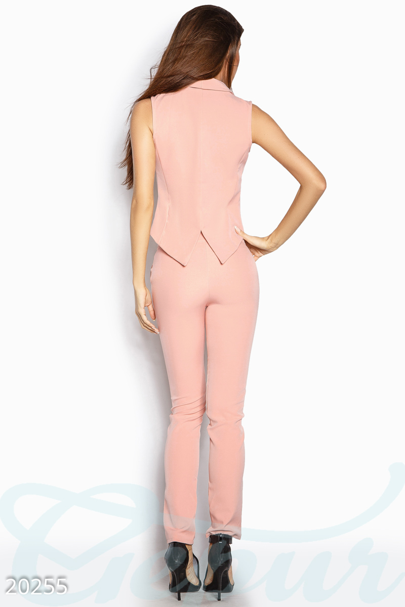 Стильный костюм-двойка, выполненный из мягкой костюмной ткани: жилет с лацканами и удлиненной спинкой, зауженные брюки средней посадки с двумя прорезными карманами.