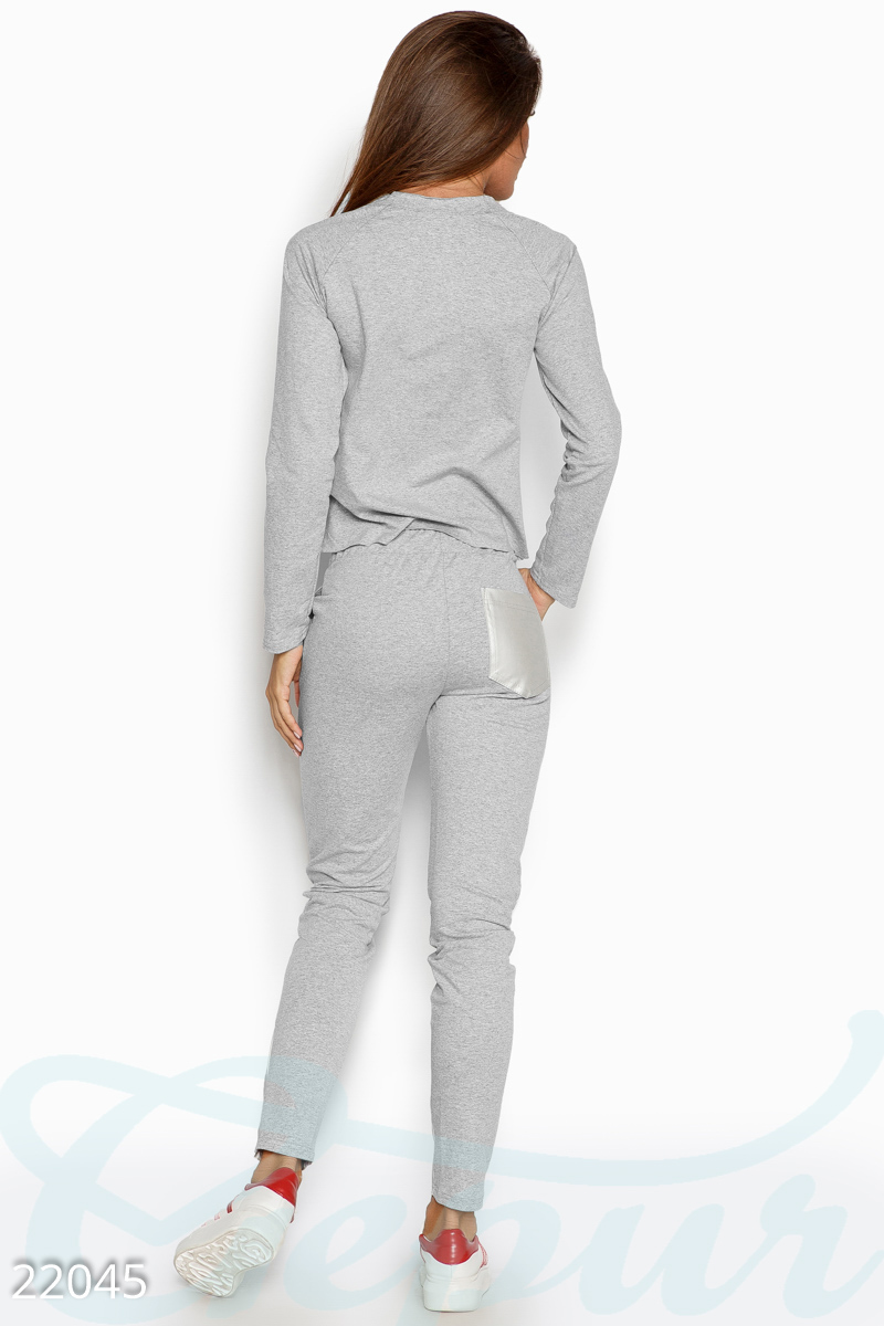 Трикотажный прогулочный костюм со вставками из эко-кожи: укороченный свитшот с длинным рукавом и актуальными необработанными краями; облегающие брюки с втачным поясом, шнурком-кулиской и двумя прорезными карманами.