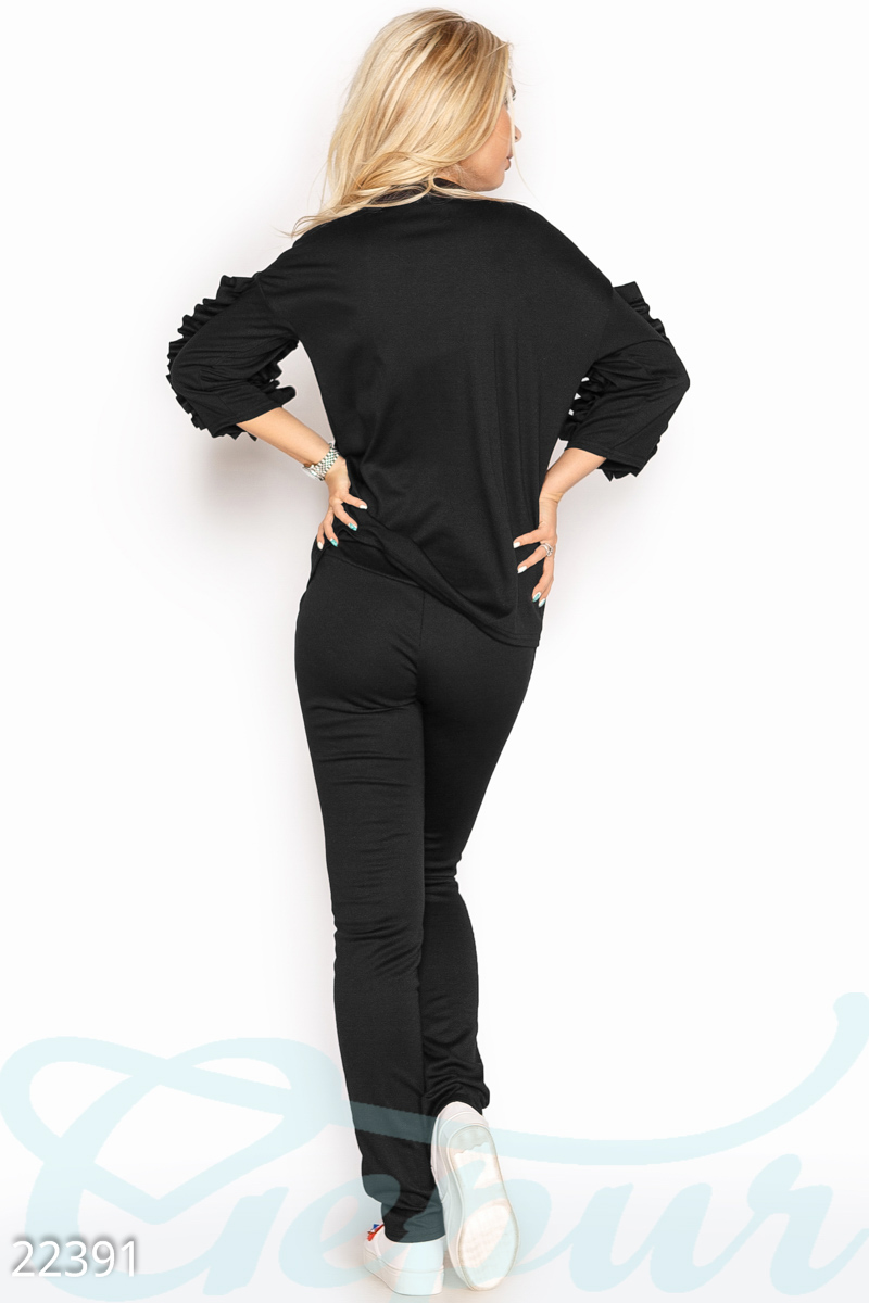 Модный повседневный костюм-двойка: классические зауженные брюки со стрелками и двумя прорезными карманами, свитшот с бусинами и коротким рукавом, украшенным рюшами.