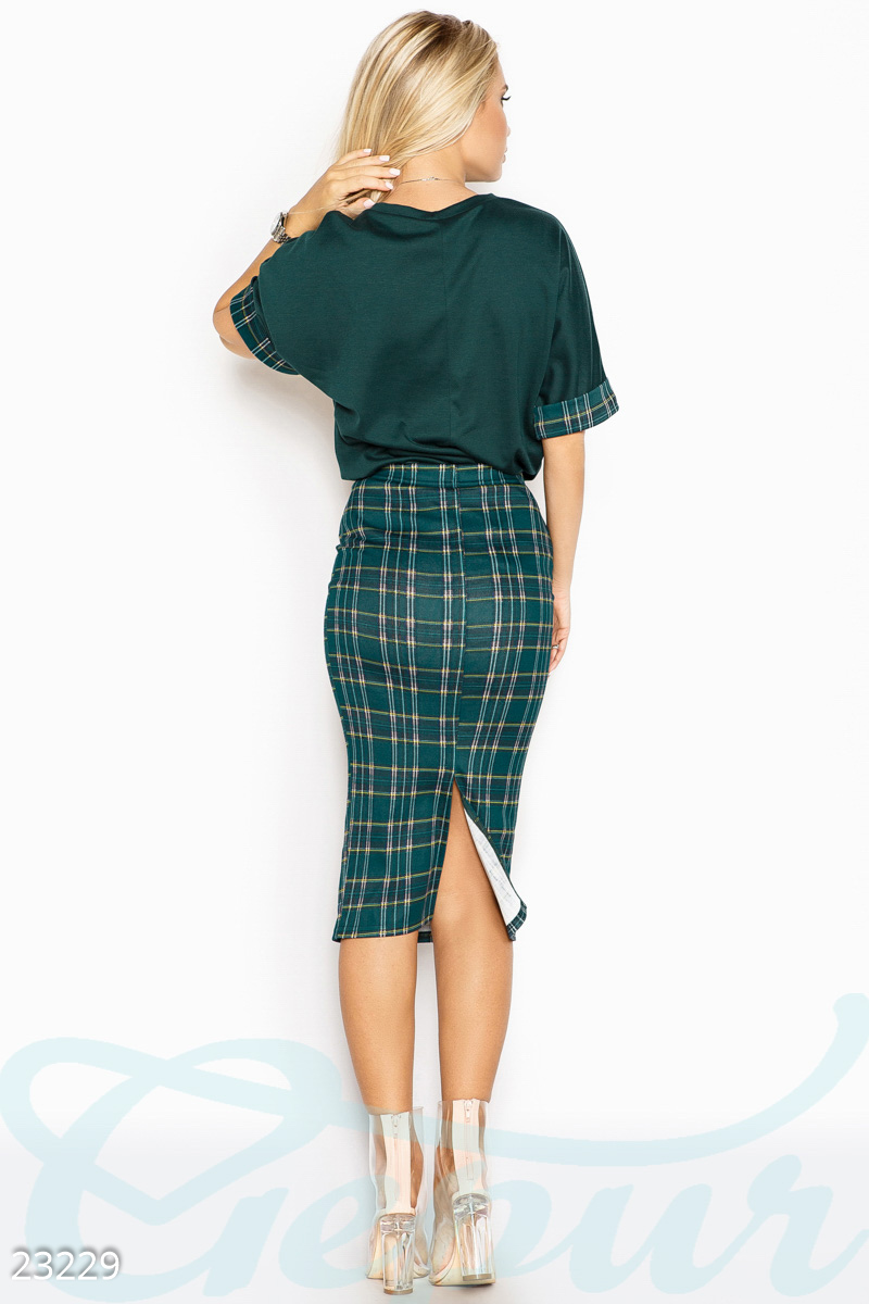 Практичный костюм из мягкого французского трикотажа в клетку: топ с ювелирным вырезом, коротким рукавом с отворотом и слегка удлиненной спинкой, классическая юбка-карандаш с резинкой на поясе и небольшим разрезом сзади.