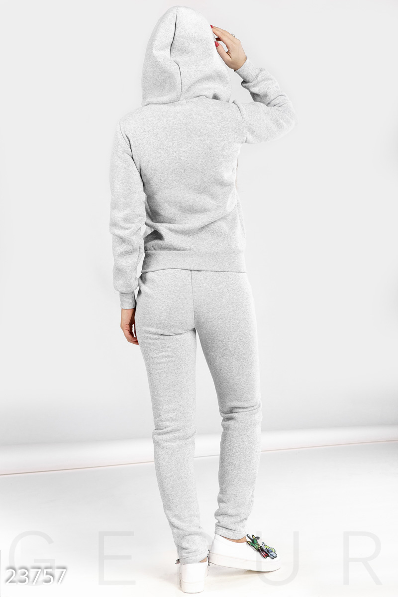 Базовый спортивный костюм, выполненный из однотонного трикотажа: куртка с капюшоном, контрастной нашивкой на груди и большими накладными карманами, брюки средней посадки с эластичным поясом и двумя карманами по бокам.