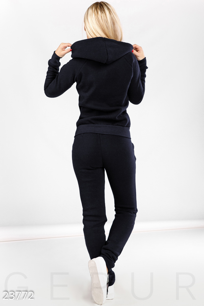 Удобный тренировочный костюм, украшенный контрастным принтом: классическая куртка с капюшоном, нашивкой на груди и двумя карманами на молнии, брюки средней посадки с карманами по бокам.