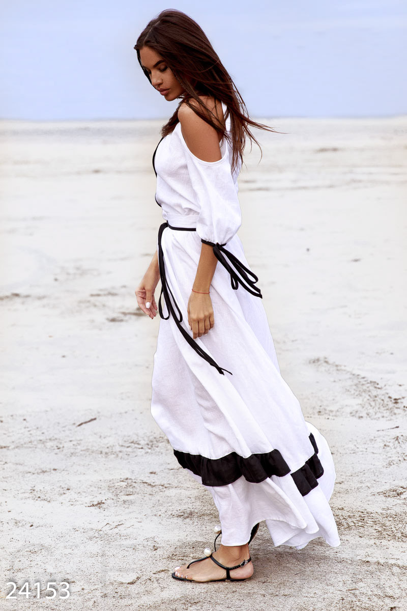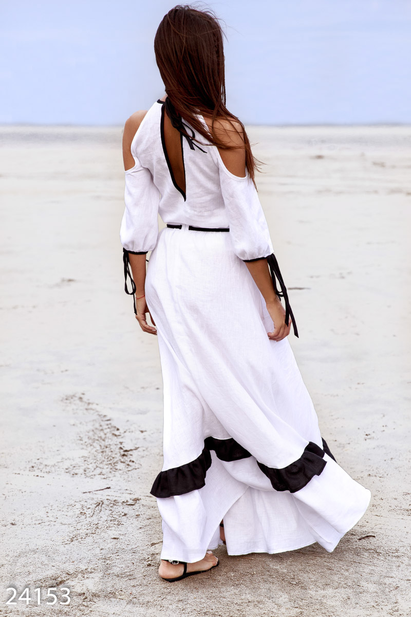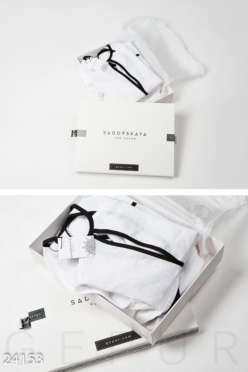Limited edition Sadovskaya for Gepur. Женственный костюм из капсульной коллекции, представленной в рамках Moscow Fashion Week и Mercedes-Benz Fashion Week Kiev. Романтичная блуза с вырезами на плечах и декольте, завязками на манжете, v-образным вырезом на спинке и небольшим разрезом на кокетке. Пышная юбка-макси с втачным поясом и завязками, украшенная контрастным воланом. Костюм был отмечен редакцией Vogue, как один из лучших вариантов для летнего отдыха.