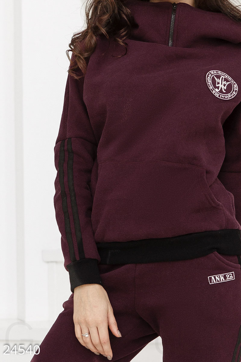 Трикотажный спортивный костюм с контрастными лампасами и нашивками: толстовка с капюшоном, молнией на горловине и карманами-кенгуру, брюки с манжетой, эластичным поясом и прорезными карманами.