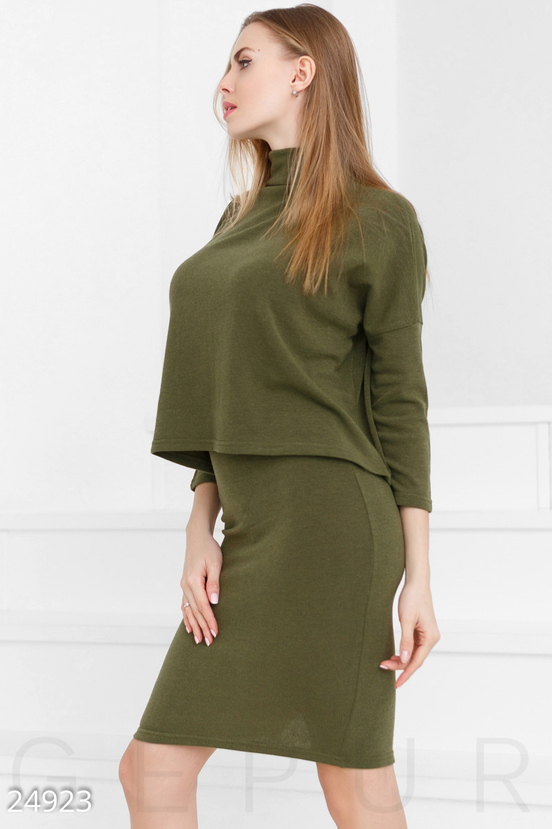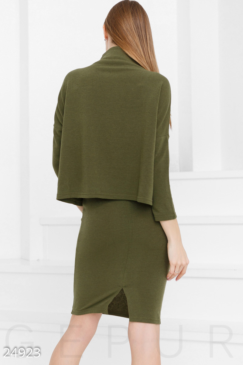 Удобный трикотажный костюм-двойка: трендовый свитер свободного кроя со спущенной линией плеча и высоким воротником, облегающая юбка высокой посадки с эластичной резинкой на поясе и небольшим разрезом сзади.