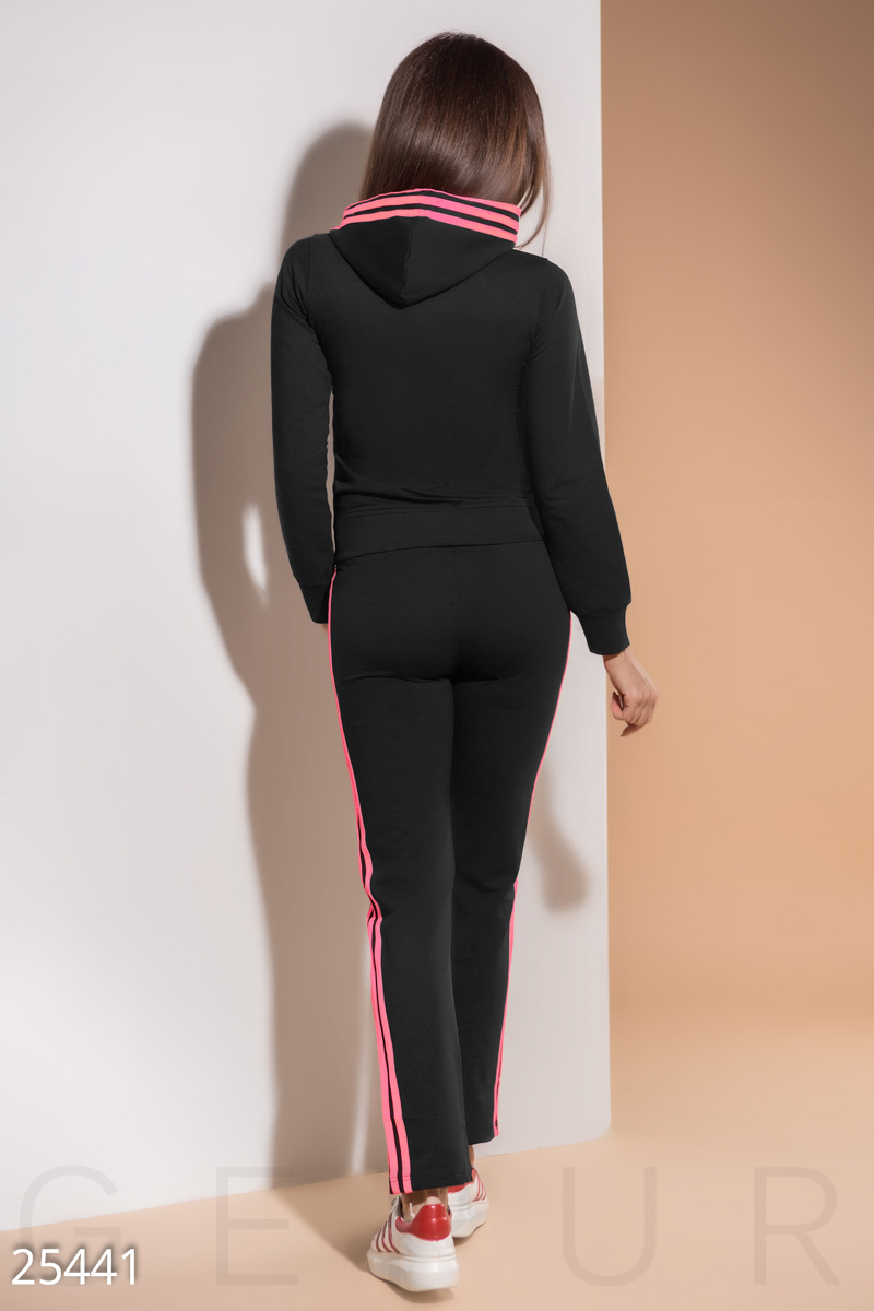 Спортивный костюм из эластичной ткани, украшенный контрастными полосками: куртка с капюшоном и двумя карманами на молнии, облегающие брюки средней посадки с завязками на поясе. .