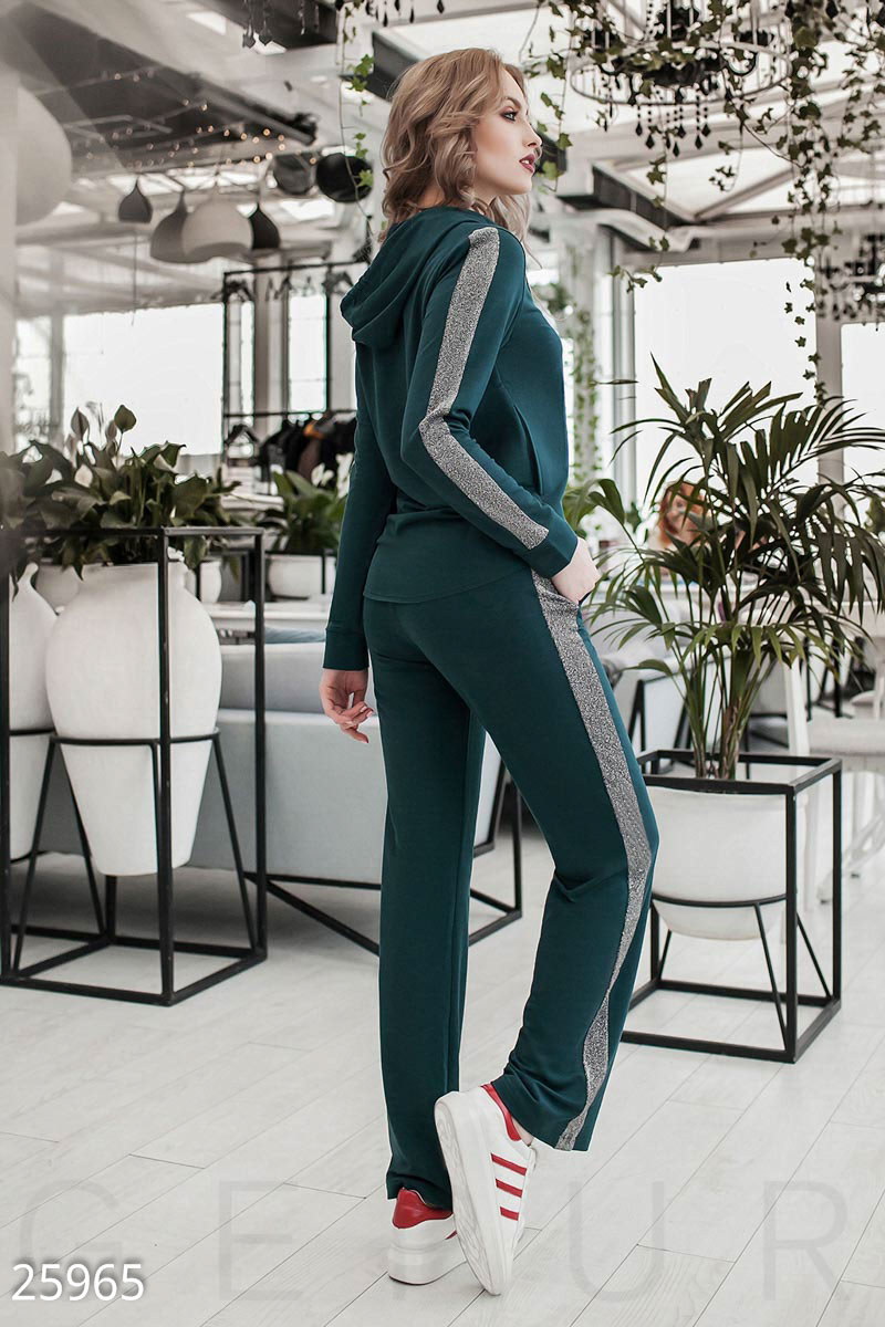 Трикотажный спортивный костюм, украшенный нитью люрекса: куртка с капюшоном, удлиненной спинкой и двумя карманами в швах, прямые брюки средней посадки с двумя прорезными карманами и эластичным поясом с завязками. .