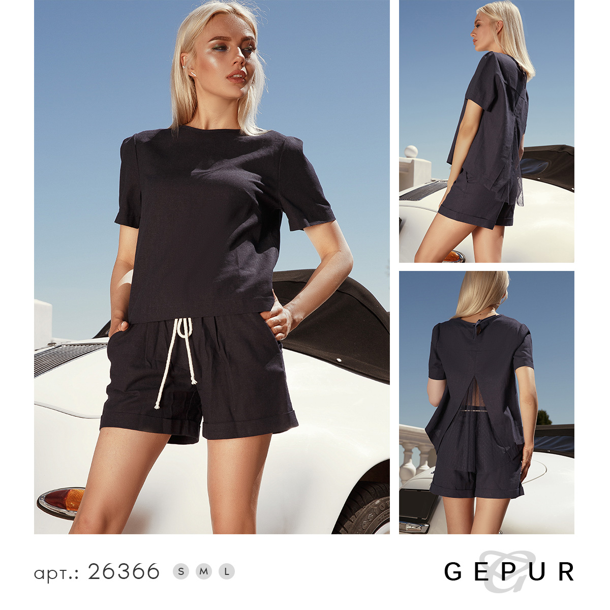Летний костюм из льняной ткани: свободный топ с коротким рукавом, разрезом с завязками и вставкой из сетки на спинке, короткие шорты с фиксированным отворотом, эластичным поясом, съемным ремешком-канатом и прорезными карманами.