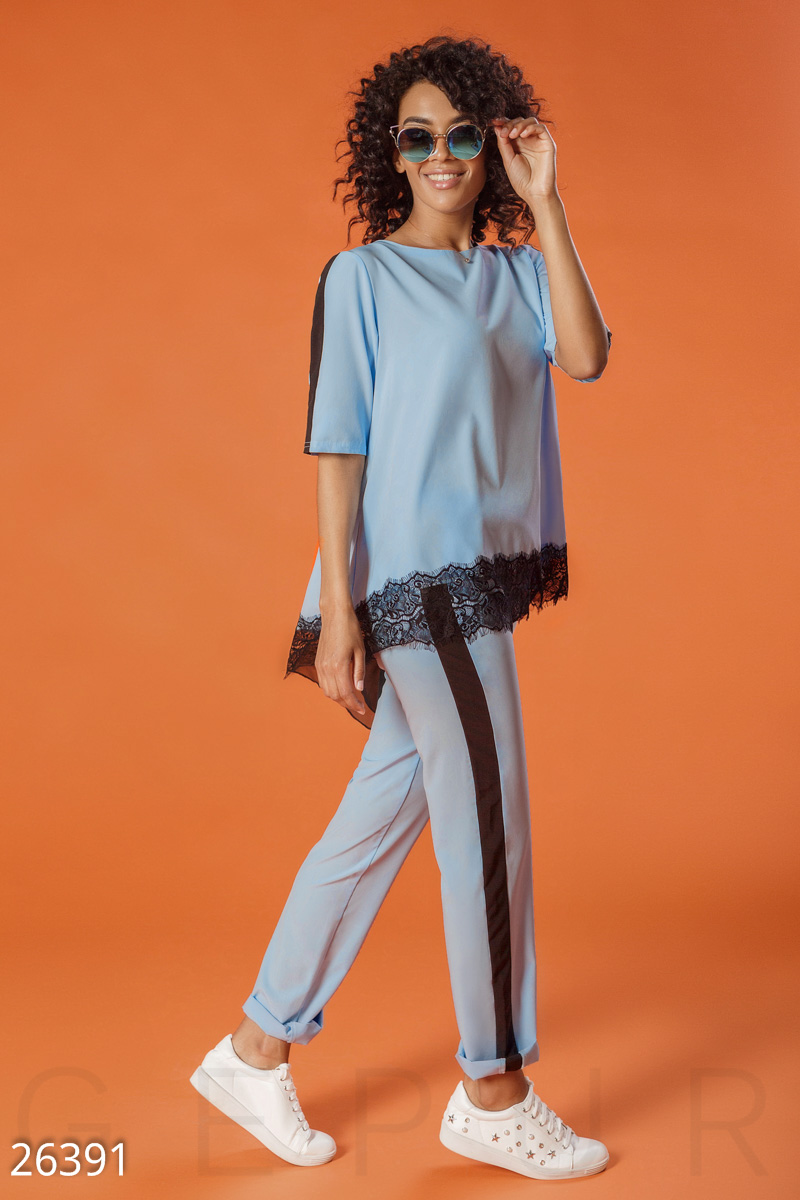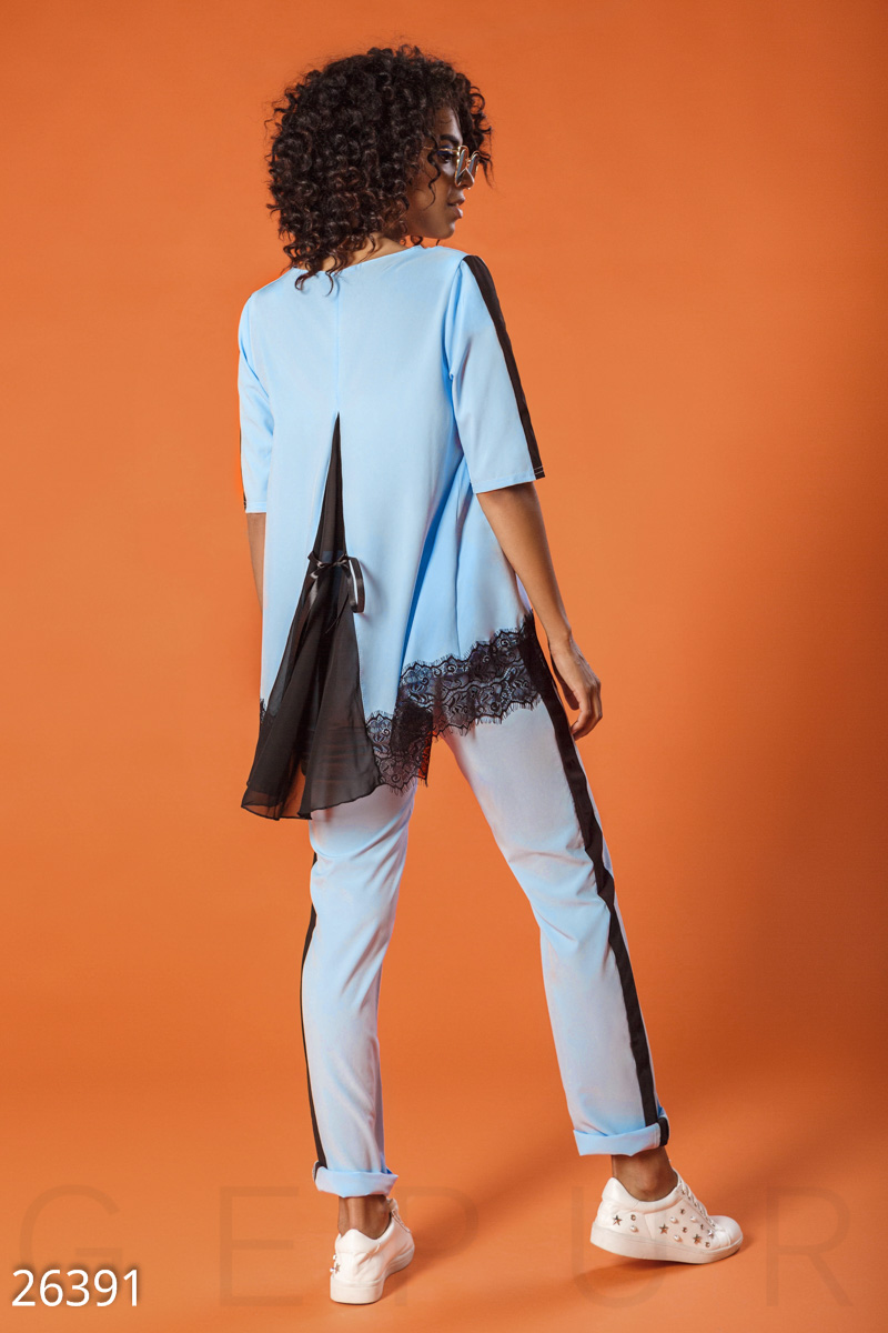 Легкий двухцветный костюм с кружевной отделкой: свободная блуза асимметричного кроя с контрастной вставкой на спинке, зауженные брюки средней посадки с эластичным поясом.