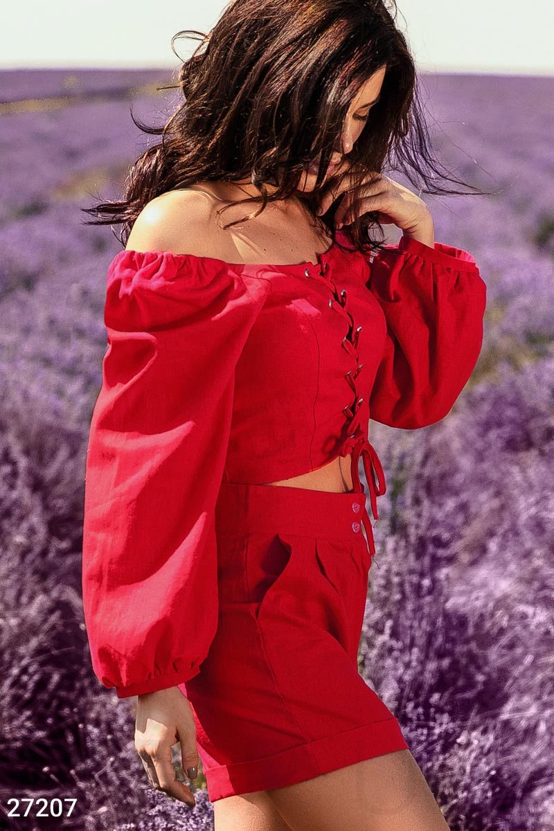 Романтичный летний костюм из льна: укороченная блуза с открытыми плечами, шнуровкой и пышным рукавом-фонарик, короткие шорты с высокой посадкой, отворотом и двумя прорезными карманами. ...