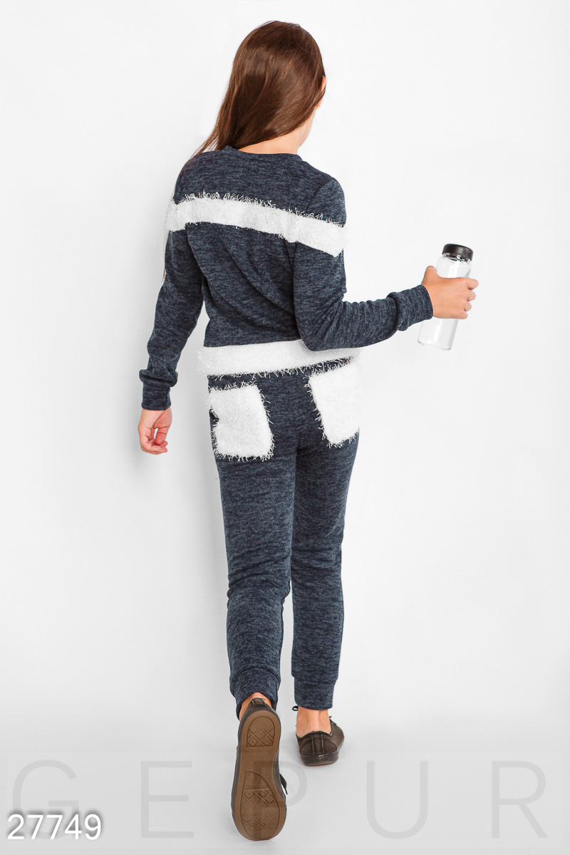 Теплый трикотажный костюм, дополненный контрастными вставками: комфортный свитшот и брюки средней посадки с манжетами, эластичным поясом, двумя прорезными и накладными карманами.