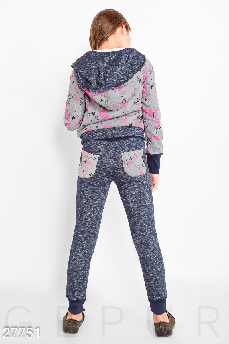 Теплый спортивный костюм из теплого трикотажа: куртка с капюшоном и двумя карманами по бокам, брюки с эластичным поясом, манжетами, двумя прорезными и накладными карманами.