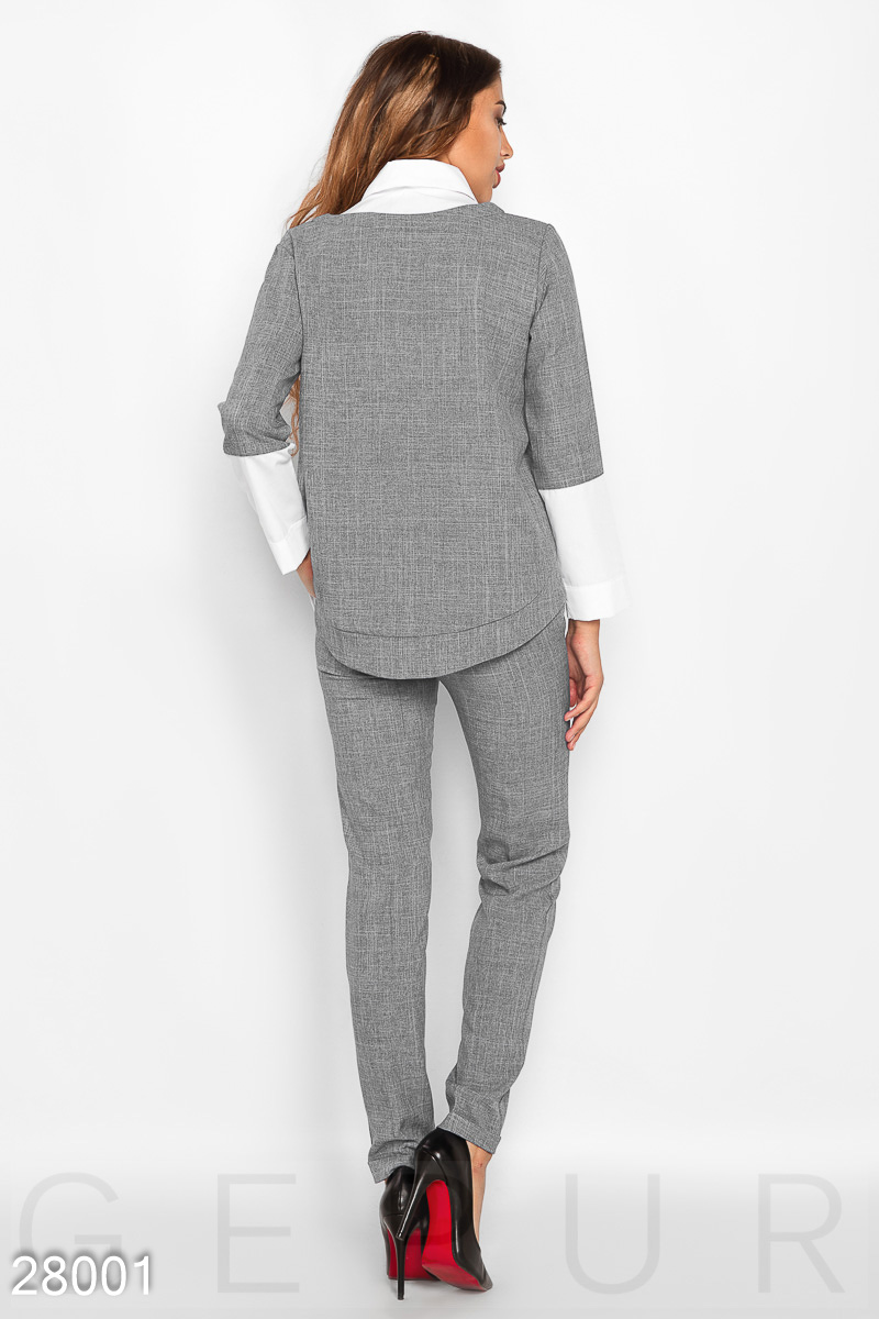 Офисный костюм-двойка, выполненный из легкого габардина: комбинированная блуза-рубашка c удлиненной спинкой и пришивным воротником, манжетами и подолом, выполненными из хлопка; зауженные брюки средней посадки с эластичным поясом, двумя карманами по бокам и фиксированными отворотами.
