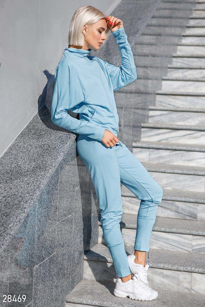 Оригинальный спортивный костюм, выполненный из мягкого трикотажа: куртка с асимметричной разъемной молнией, высоким воротником, рукавом-реглан с высокой манжетой и двумя карманами в швах; брюки с высокой посадкой, широким эластичным поясом, двумя карманами в швах и широкой манжетой с застежкой на молнию.