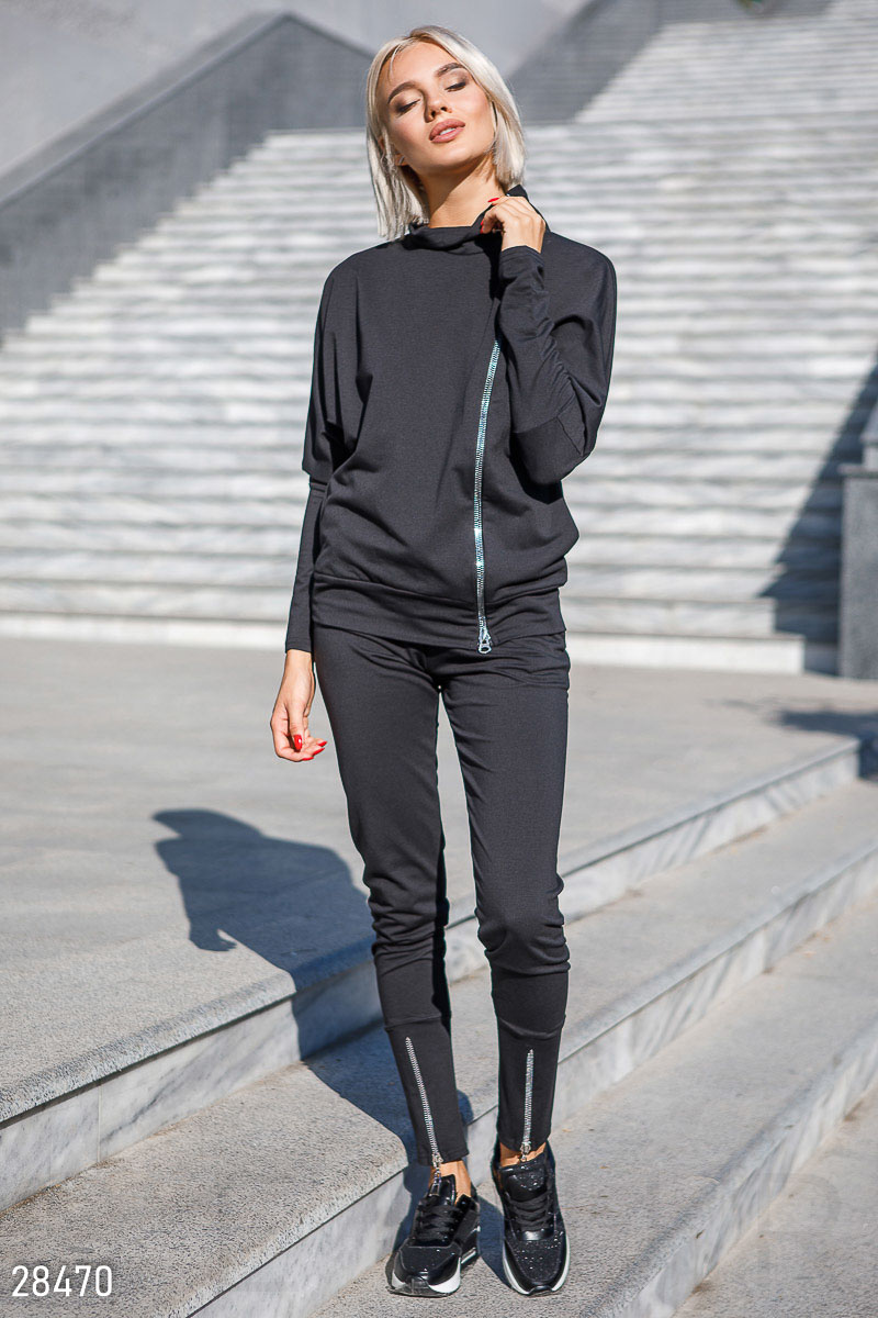 Оригинальный спортивный костюм, выполненный из мягкого трикотажа: куртка с асимметричной разъемной молнией, высоким воротником, рукавом-реглан с высокой манжетой и двумя карманами в швах; брюки с высокой посадкой, широким эластичным поясом, двумя карманами в швах и широкой манжетой с застежкой на молнию. .
