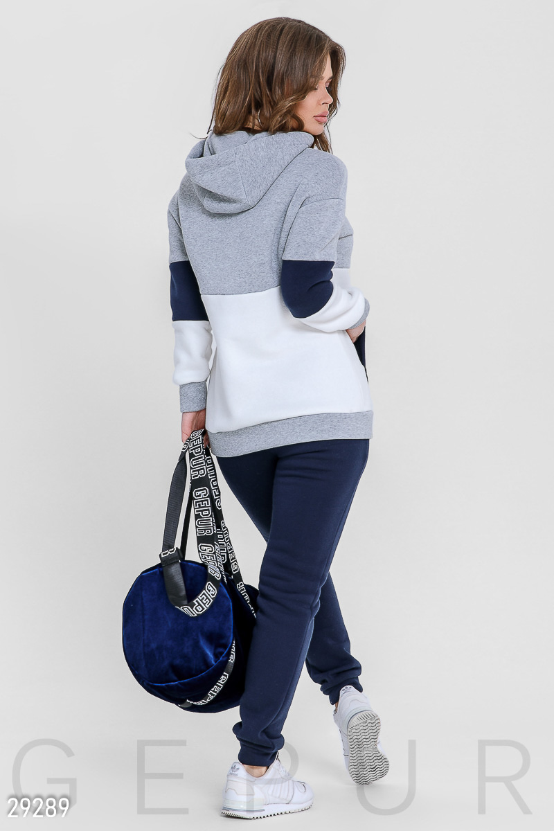 Утепленный спортивный костюм: толстовка с капюшоном и большим карманом спереди, брюки с завышенной посадкой, двумя прорезными карманами и эластичными манжетами .