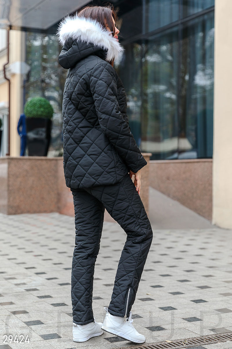 Теплый зимний костюм, выполненный из стеганой плащевой ткани с утеплителем: куртка на молнии с двумя накладными карманами и удобным капюшоном с контрастным эко-мехом, брюки средней посадки с эластичным поясом и небольшими молниями по бокам. .