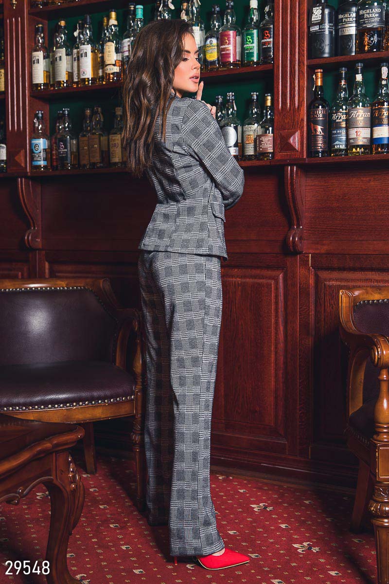 Классический брючный костюм: асимметричный двубортный жакет с лацканами, двумя карманами-обманками с клапаном и брюки с высокой посадкой.
