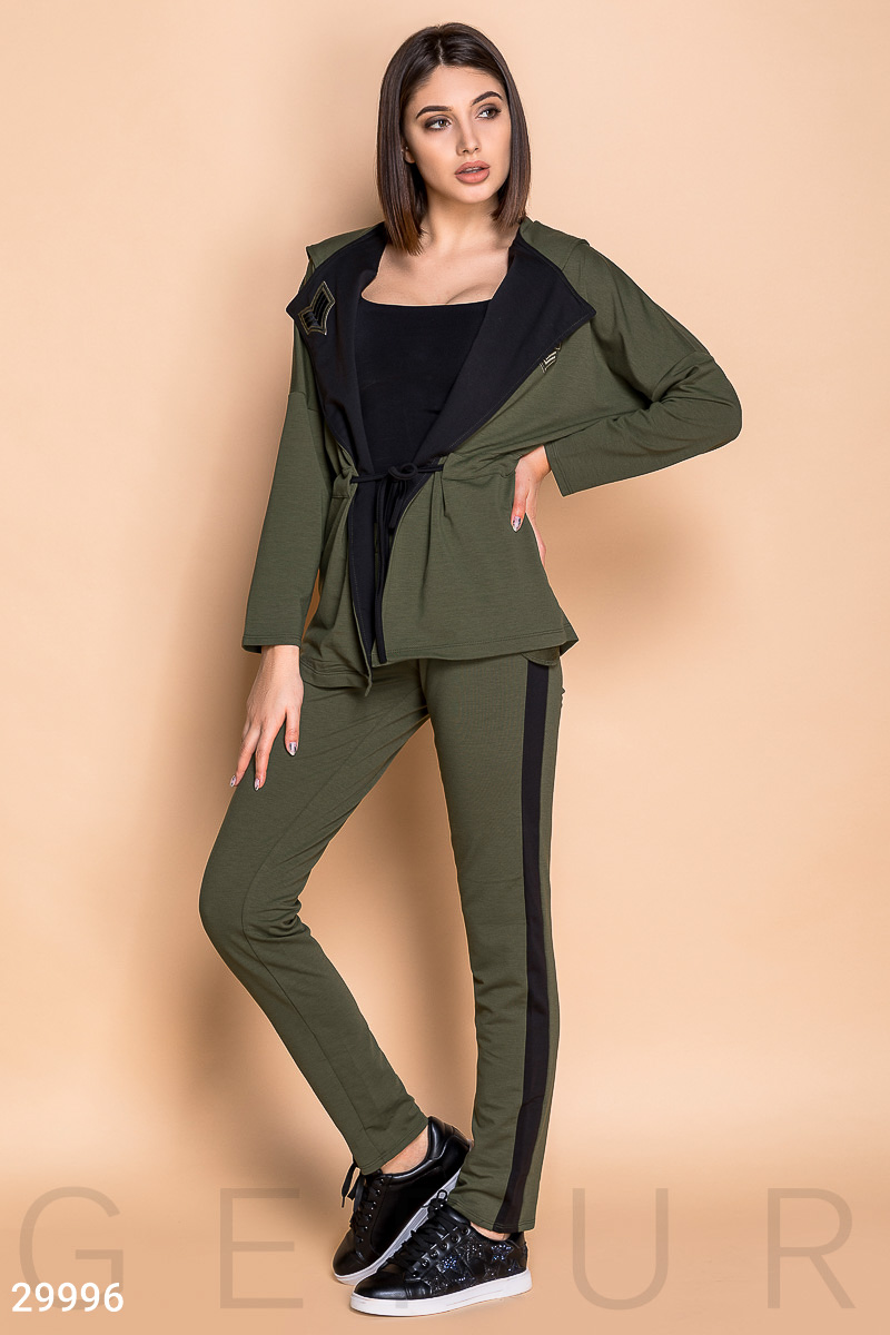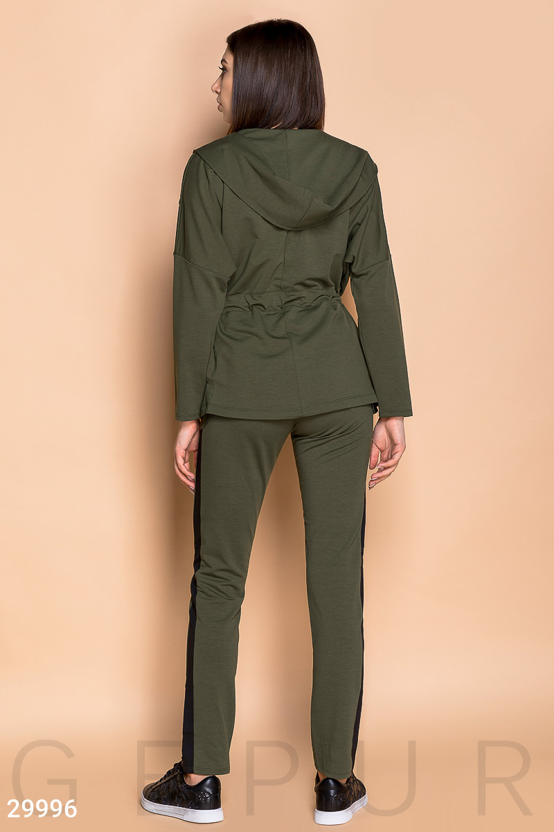 Стильный костюм в стиле милитари: кардиган с цельнокроеным рукавом и спущенной линией плеча, капюшоном, контрастными лацканами с нашивкой, карманами в швах и завязками на кулиске, брюки на эластичном поясе и лампасами. ,,