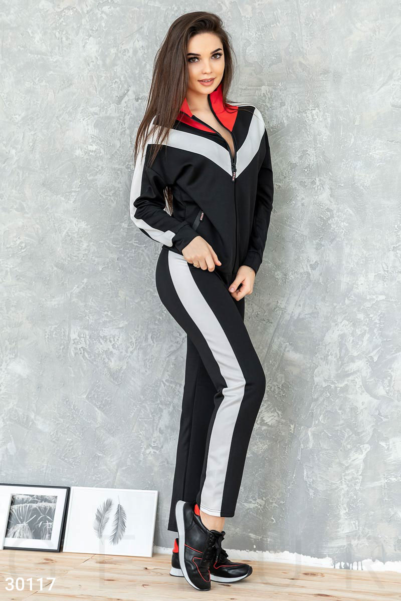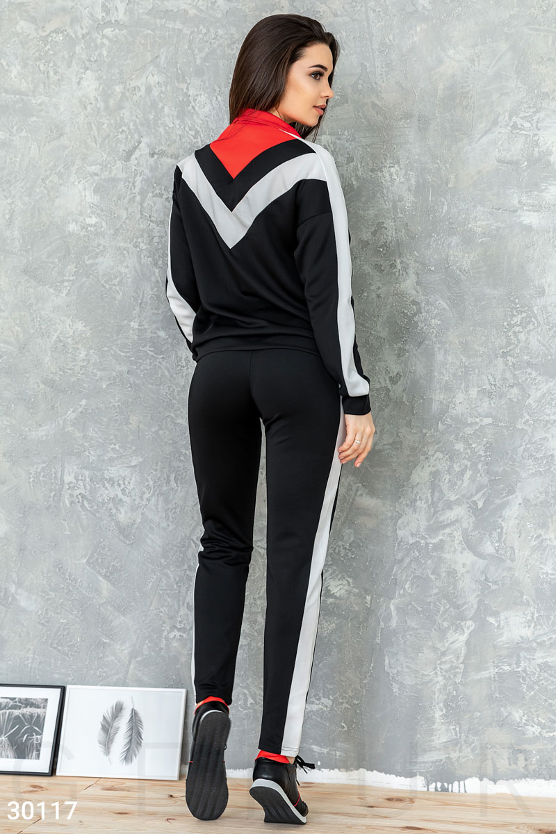 Женский спортивный костюм: куртка с длинным рукавом, воротником-стойкой, двумя прорезными карманами на молнии и контрастными вставками, брюки с высокой посадкой, на эластичном поясе и лампасами. , ,