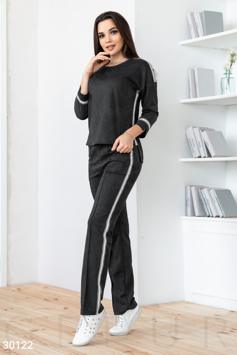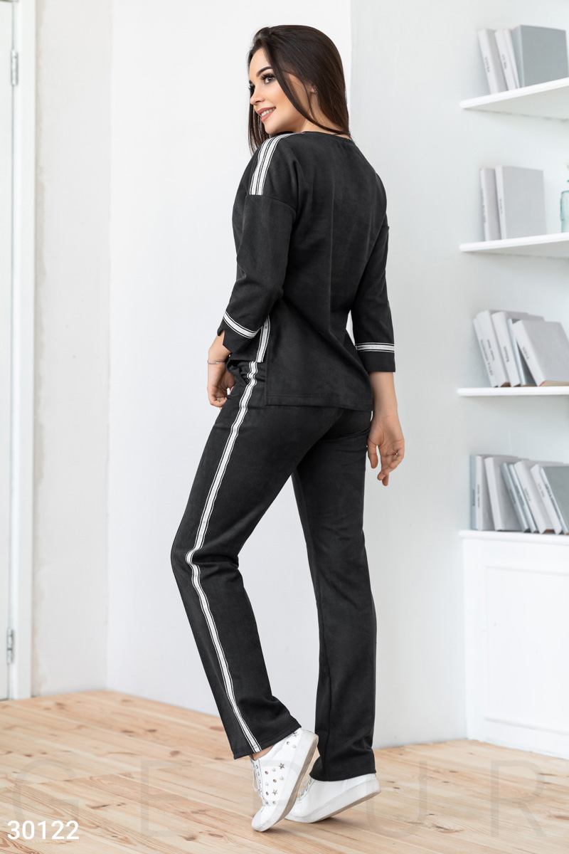 Костюм из эко-замши: джемпер с аккуратным круглым вырезом, удлиненной спинкой, рукавом 3/4, декорированный контрастными вставками, брюки с высокой посадкой, эластичным поясом, двумя прорезными карманами, фиксированными стрелками по всей длине и лампасами.