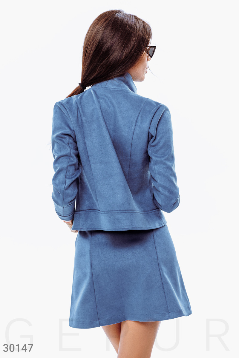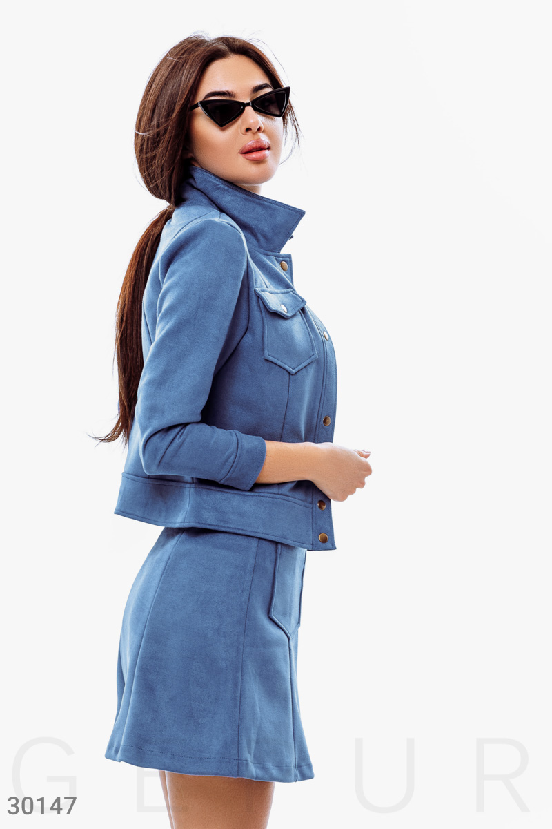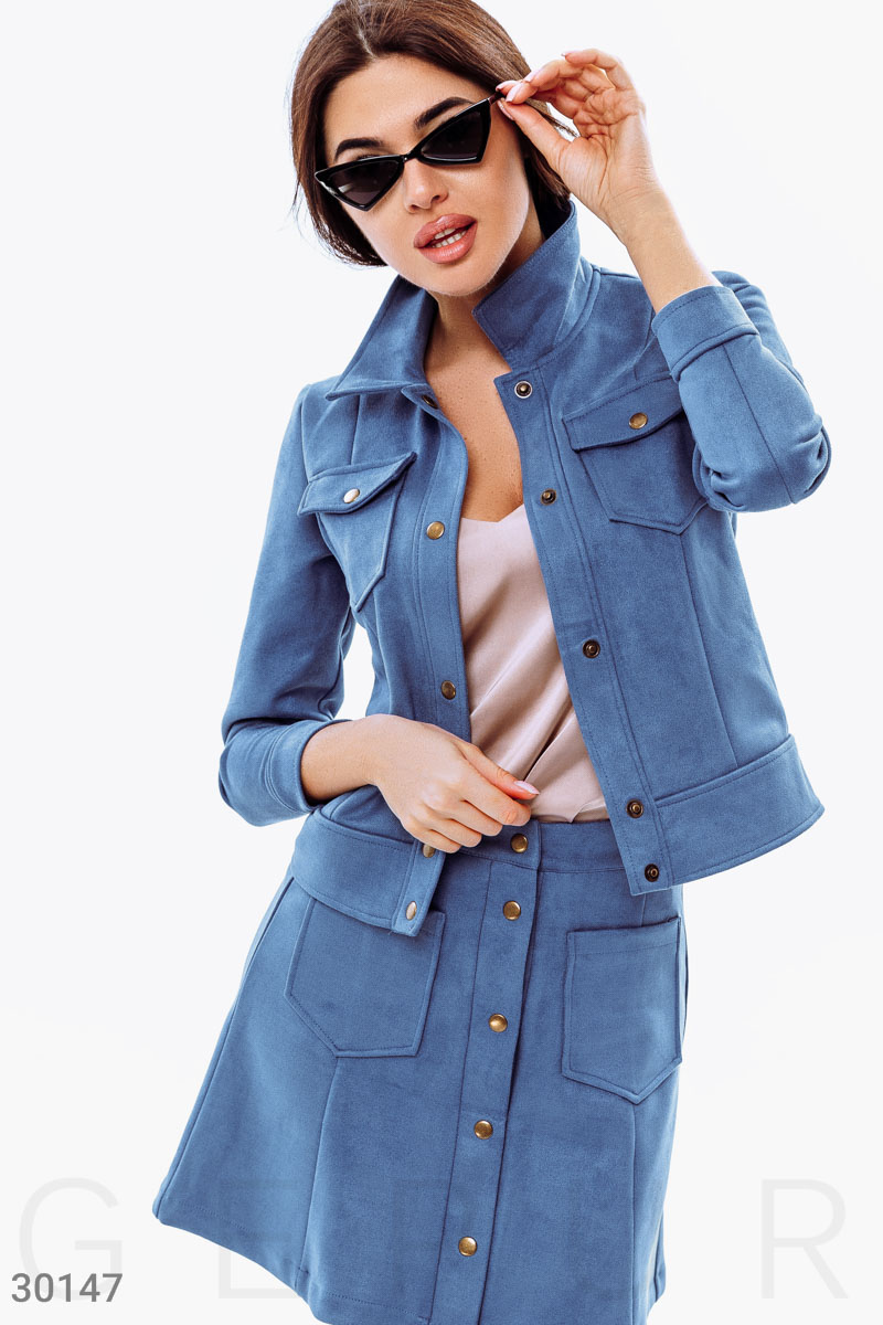 Женский костюм-двойка: жакет с классическим отложным воротником, длинным рукавом с манжетой на кнопке, двумя накладными карманами с клапанами, юбка-трапеция с глубокими накладными карманами спереди.