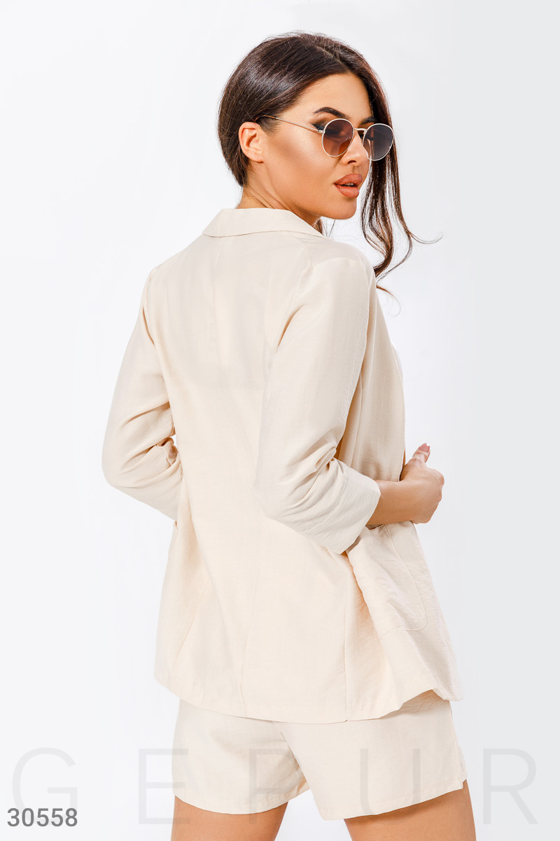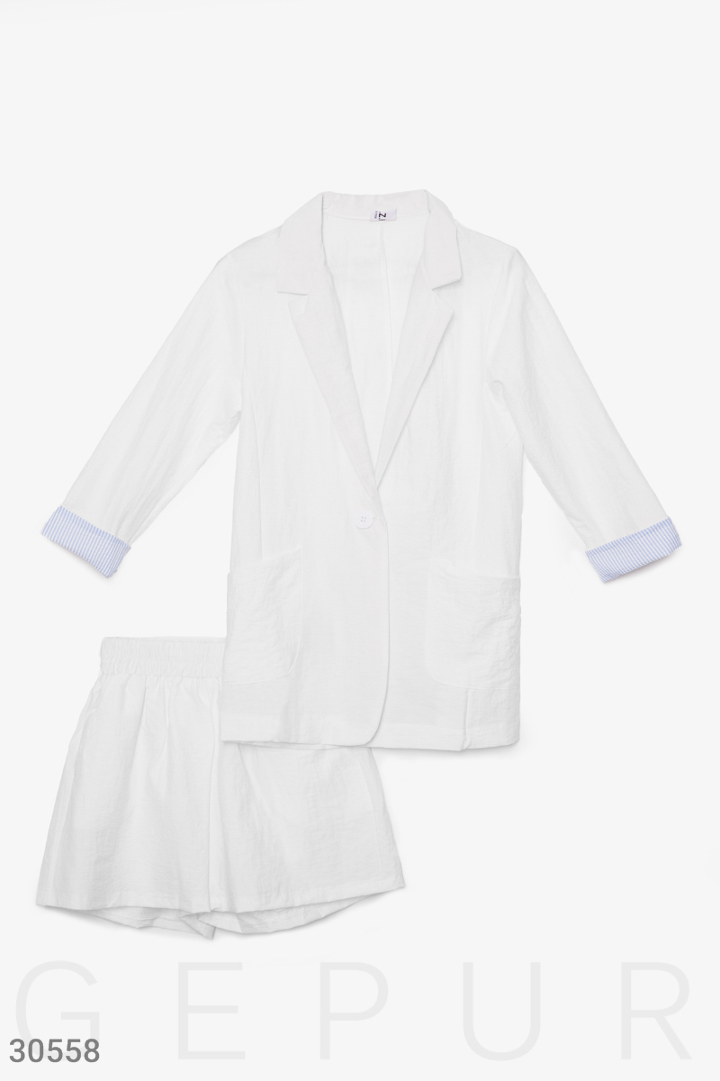 Деловой костюм: жакет с отложным воротником и лацканами, длинным рукавом с контрастной манжетой и двумя накладными карманами, шорты на подкладе, с высокой посадкой, на эластичном поясе, двумя прорезными карманами по бокам. ...