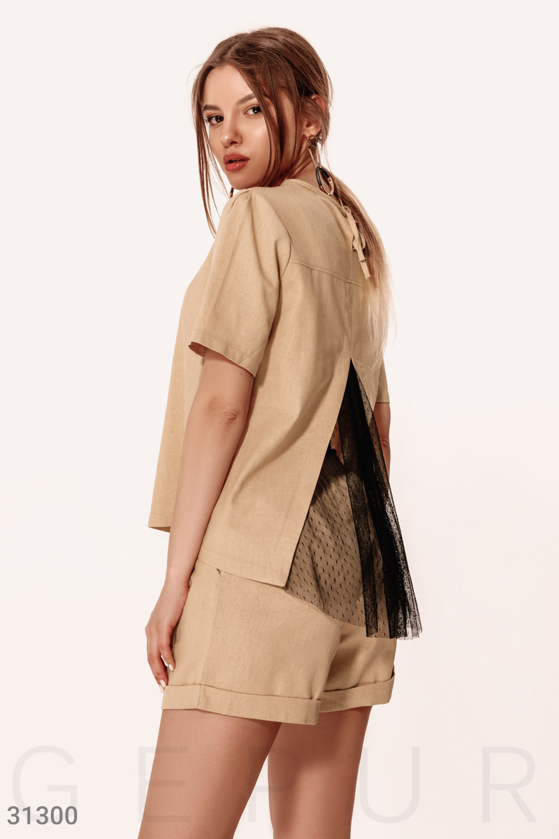 Летний костюм из льняной ткани: свободный топ с коротким рукавом, разрезом с завязками и вставкой из сетки на спинке, короткие шорты с фиксированным отворотом, эластичным поясом, съемным ремешком-канатом и прорезными карманами. ...