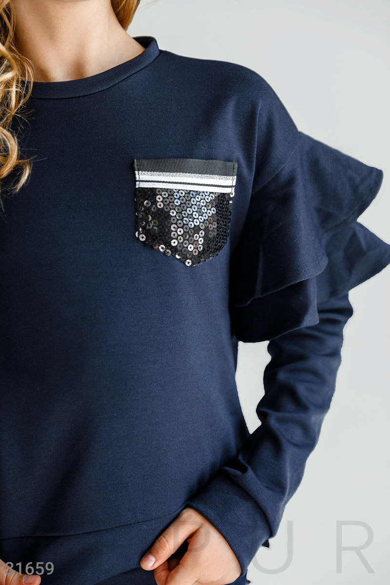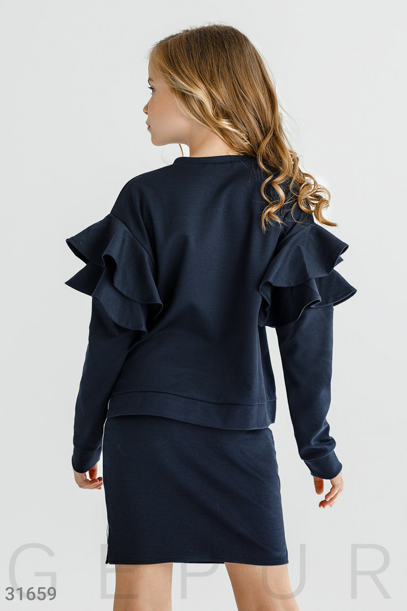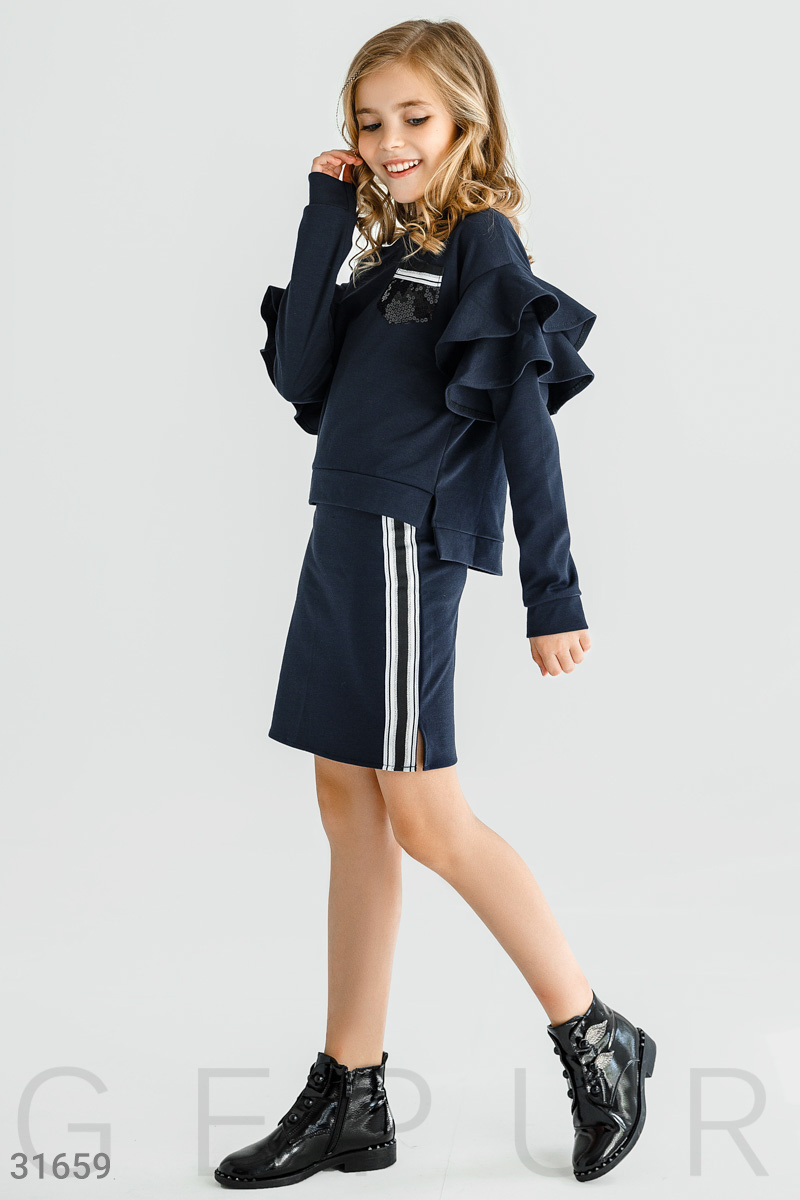 Уютный костюм-двойка: свитшот с круглым вырезом, удлиненной спинкой, длинным рукавом и воланами на плечах, короткая юбка с эластичной вставкой и контрастными лампасами.