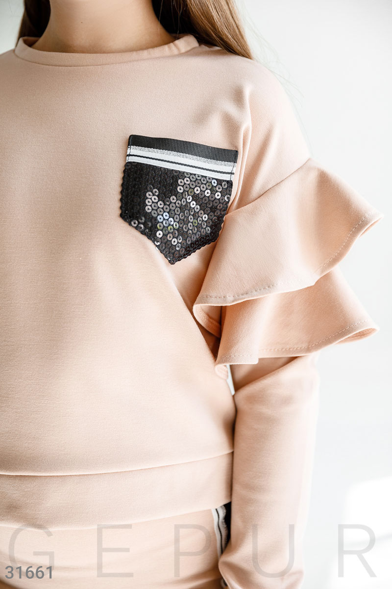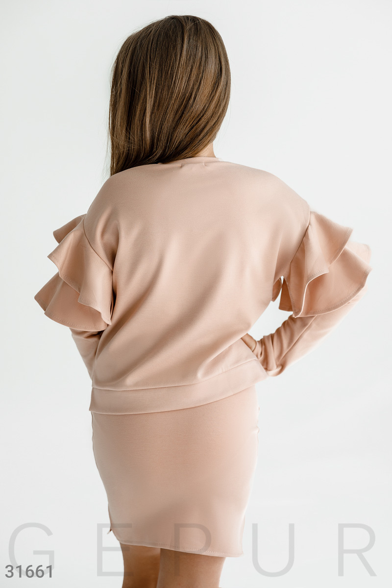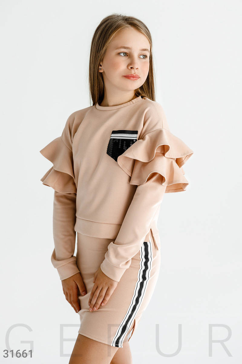 Уютный костюм-двойка: свитшот с круглым вырезом, удлиненной спинкой, длинным рукавом и воланами на плечах, короткая юбка с эластичной вставкой и контрастными лампасами.