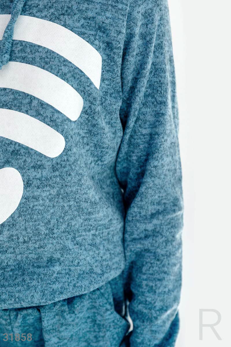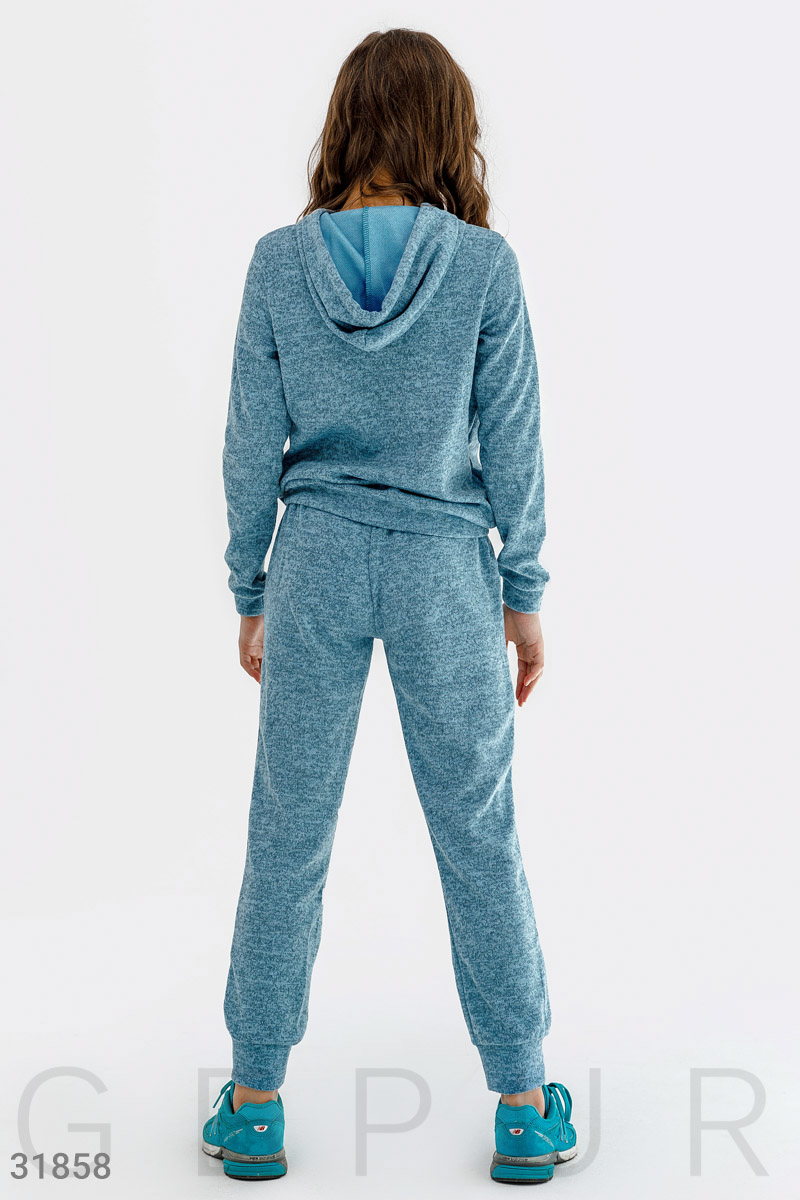 Актуальный трикотажный костюм: свитшот с длинным рукавом, круглым вырезом с капюшоном на завязках, спереди контрастный накат, брюки-джоггеры средней посадки на эластичном поясе, завязками и двумя прорезными карманами. Акционное предложение распространяется только на розничных клиентов.