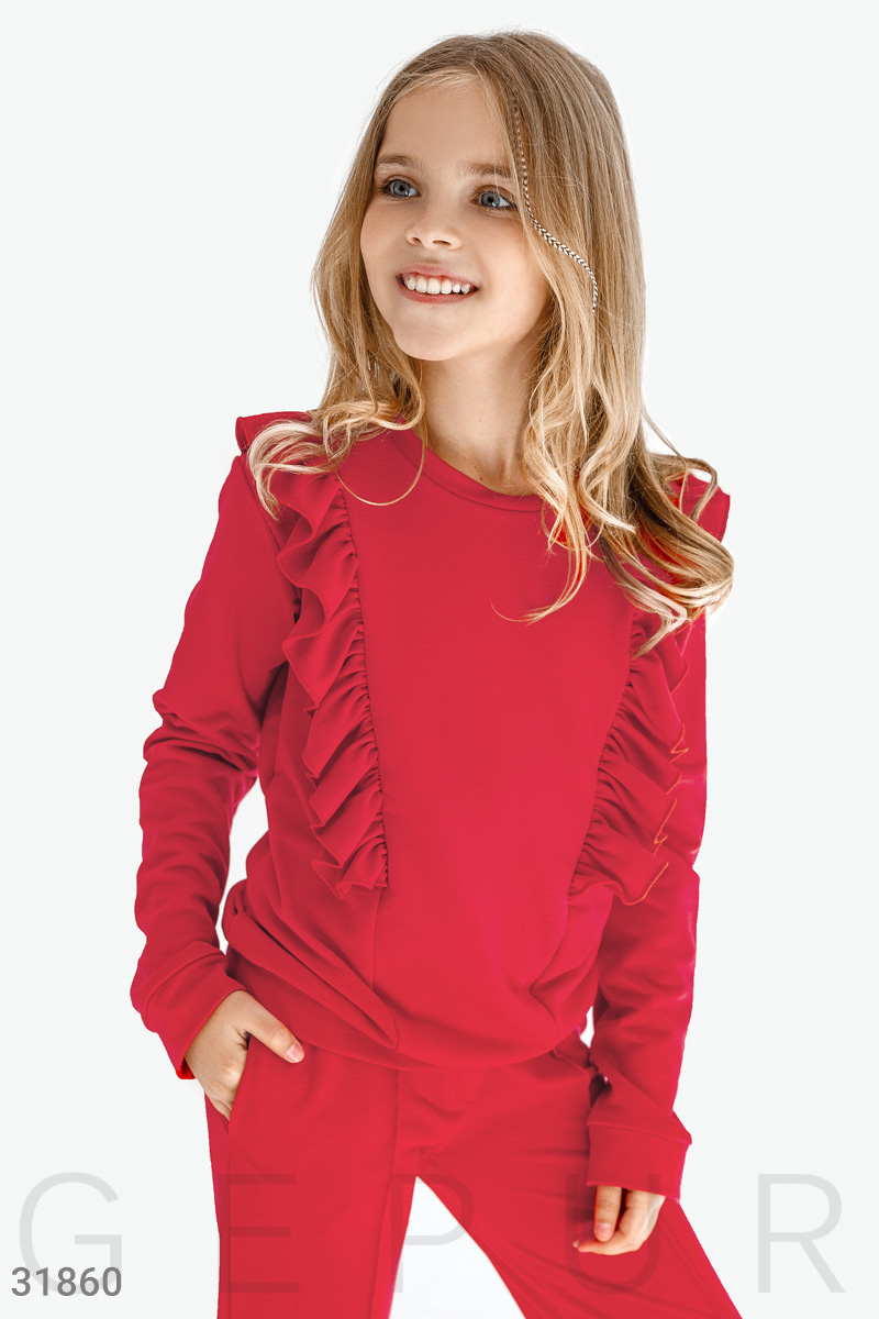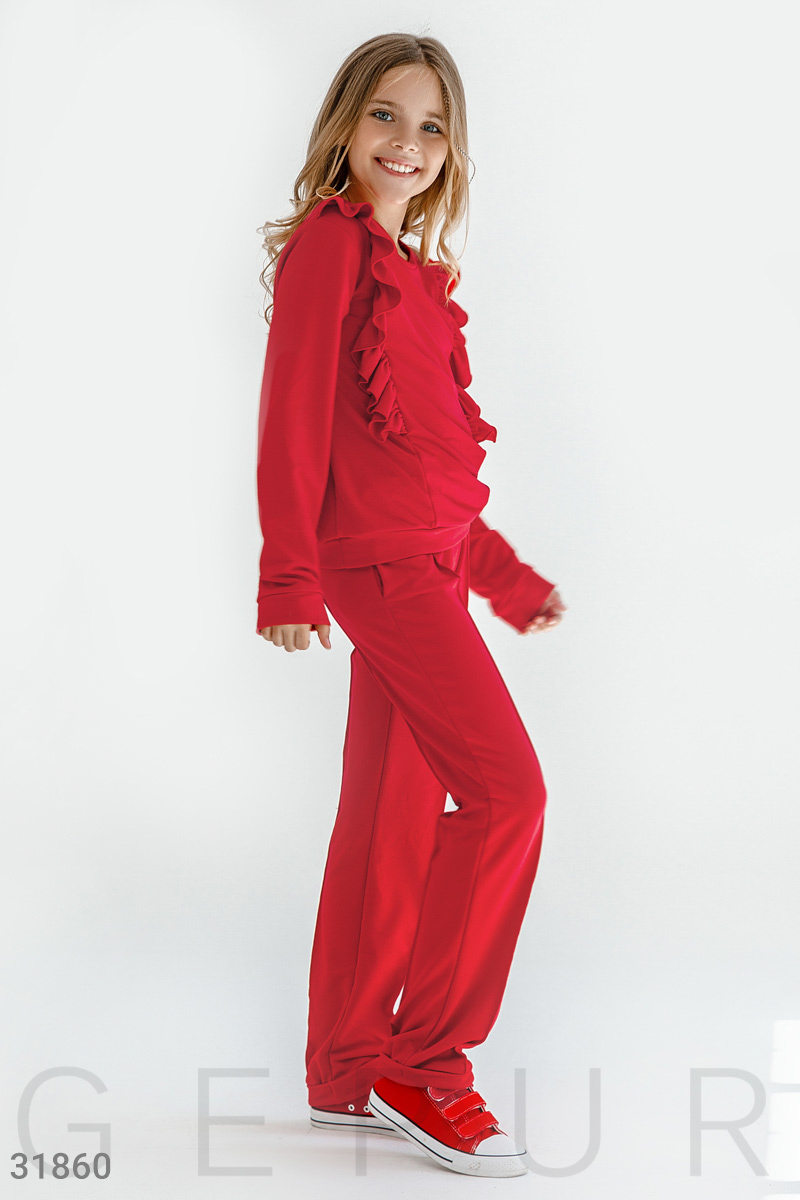 Уютный детский костюм: свитшот с длинным рукавом, круглым вырезом и рюшами, брюки средней посадки на эластичном поясе, двумя карманами в швах и фиксированными стрелками по всей длине. Акционное предложение распространяется только на розничных клиентов.