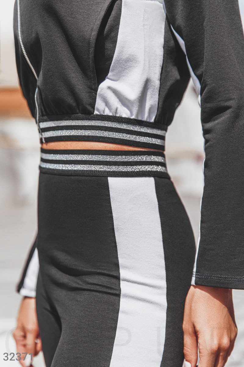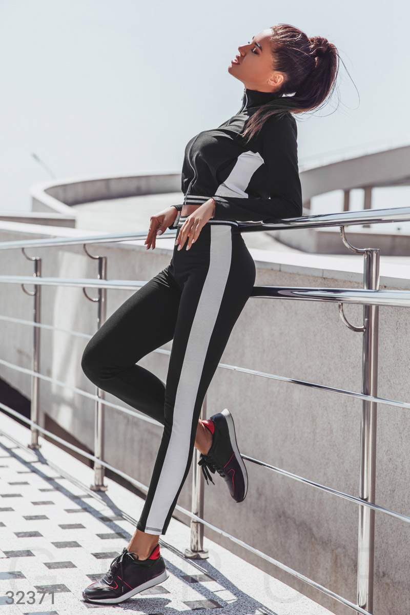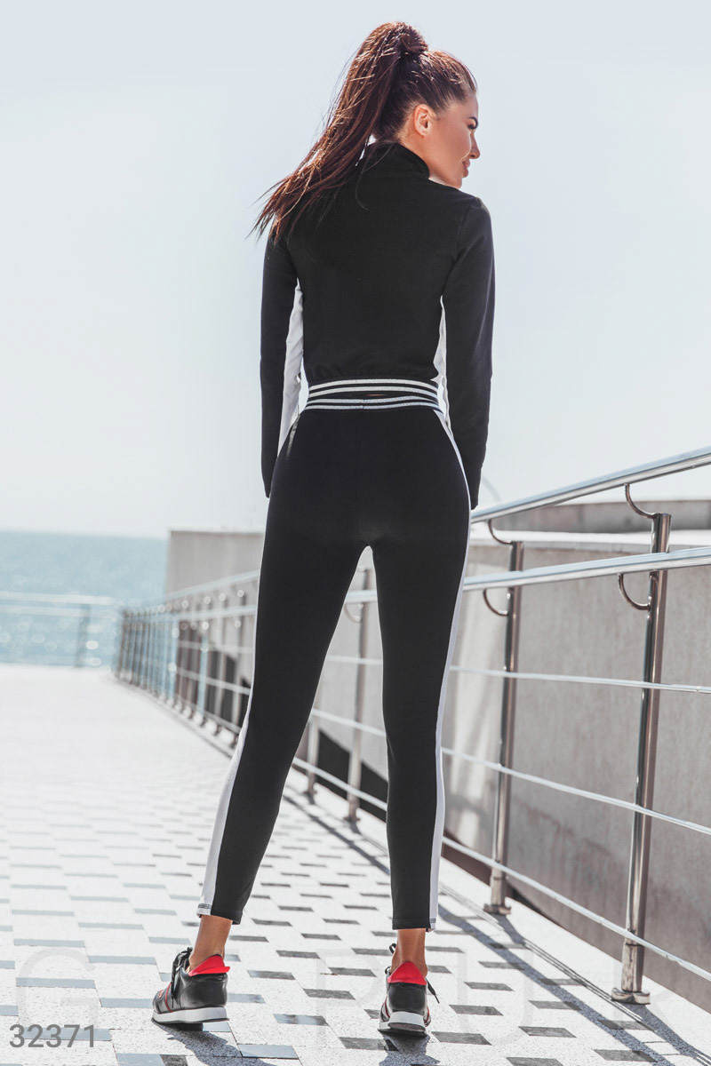 Комфортный костюм черного цвета в спортивном стиле: куртка на контрастной молнии, с воротником-стойкой, длинным рукавом, двумя прорезными карманами и эластичной вставкой на поясе, брюки с высокой посадкой, эластичной вставкой на поясе и лампасами.. ,, ,