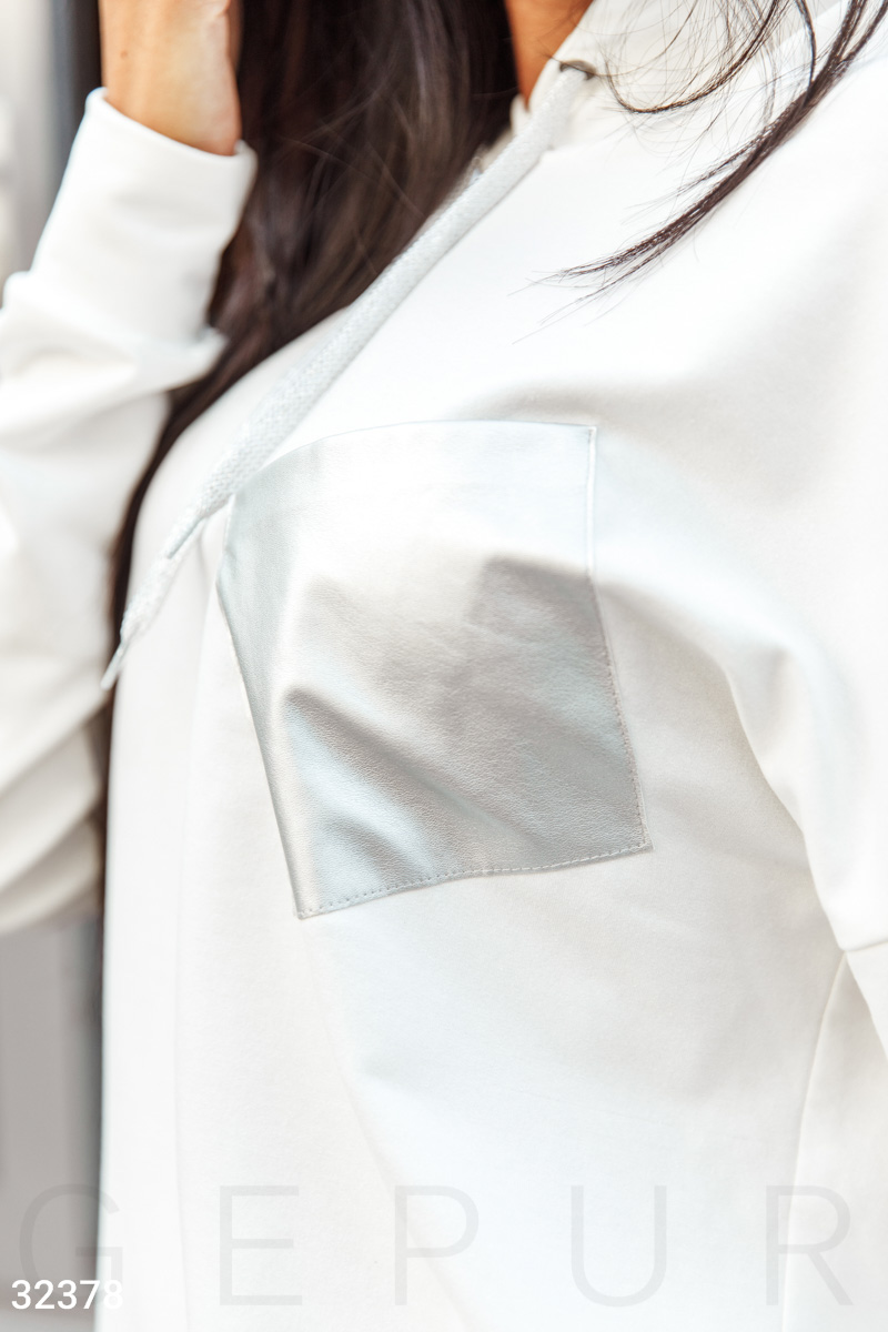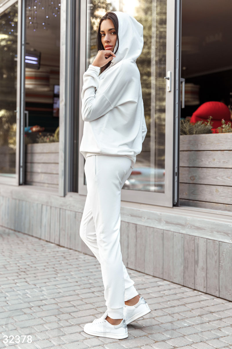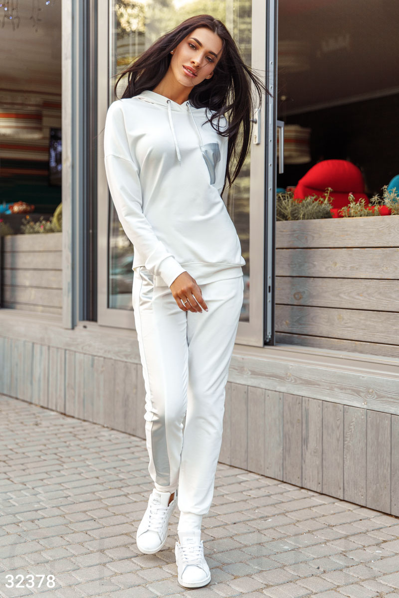 Удобный спортивный костюм молочного оттенка: асимметричный джемпер с капюшоном, длинным рукавом, накладным карманом серебристого цвета, брюки-джоггеры средней посадки с двумя карманами в швах и вставкой оттенка металлик по всей длине брючины. ,