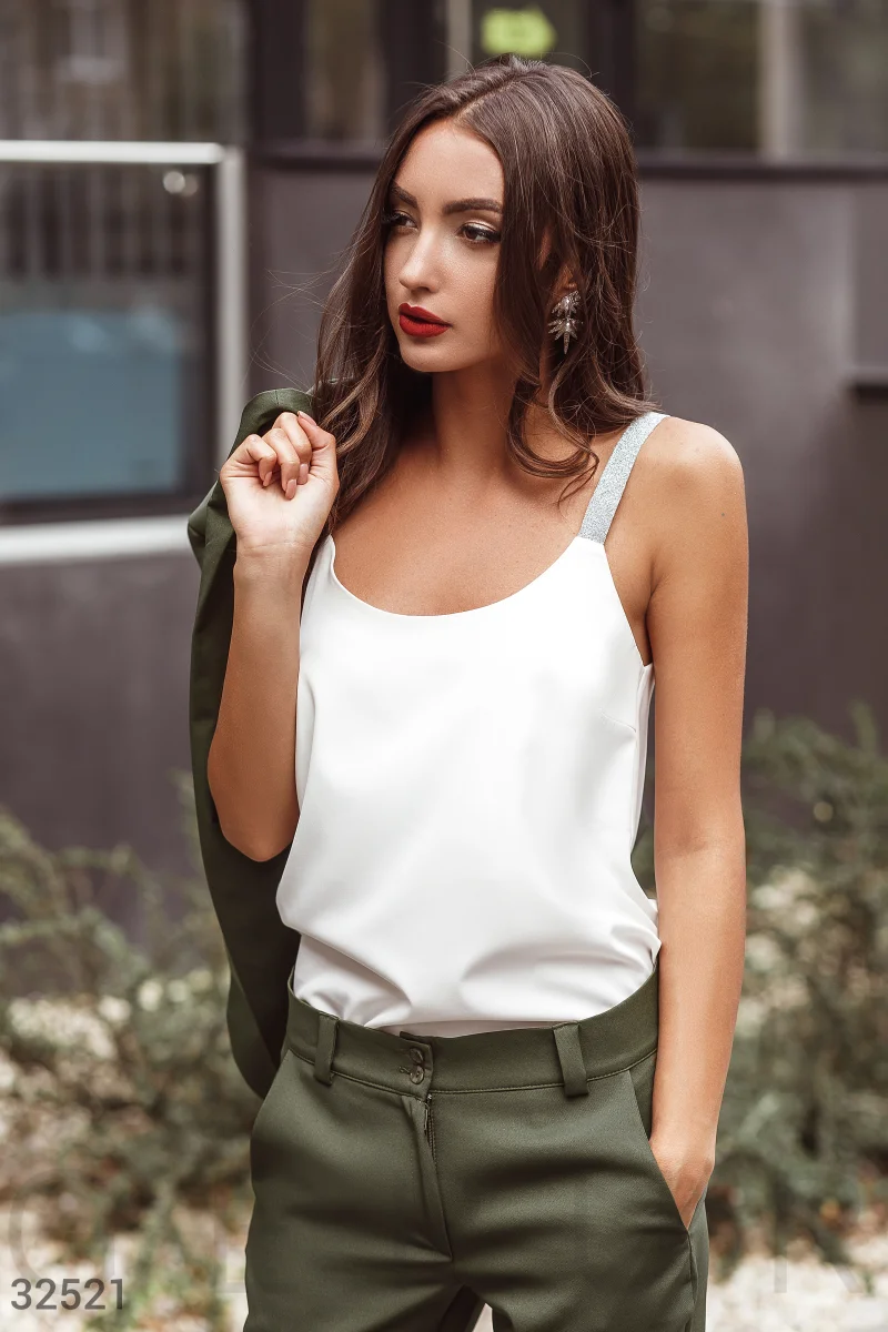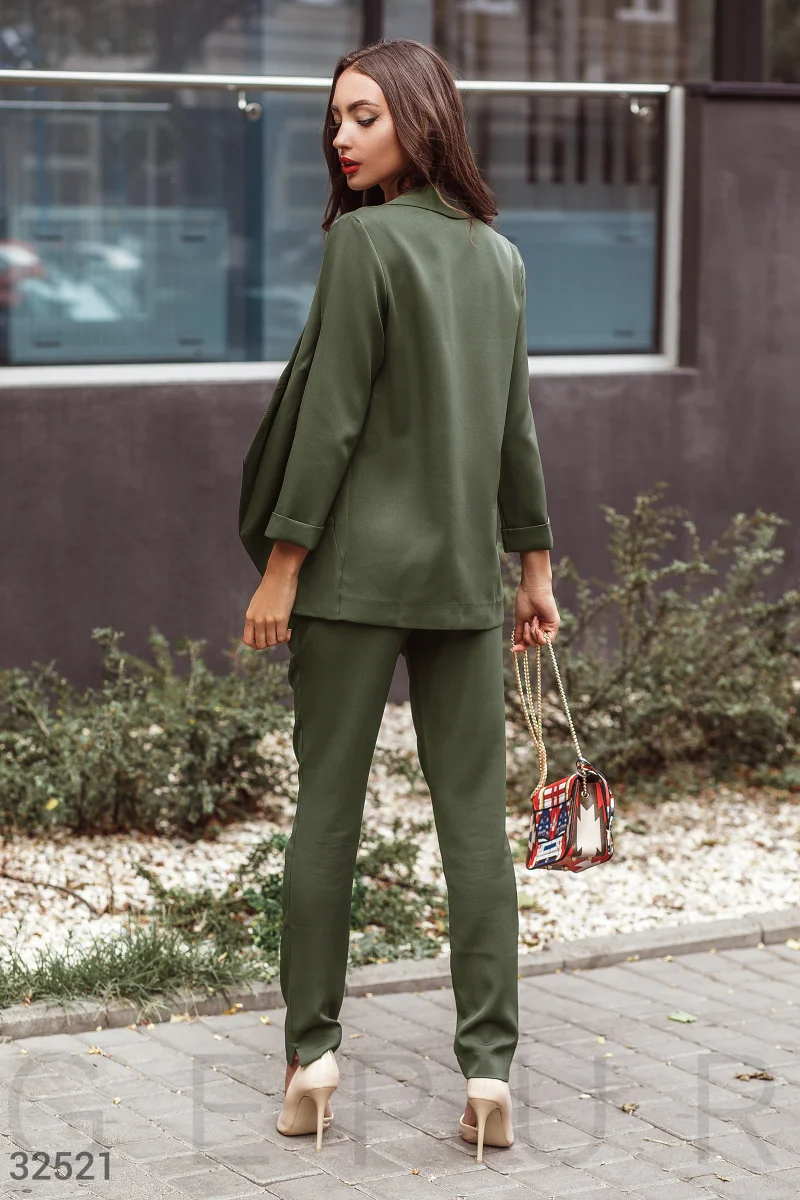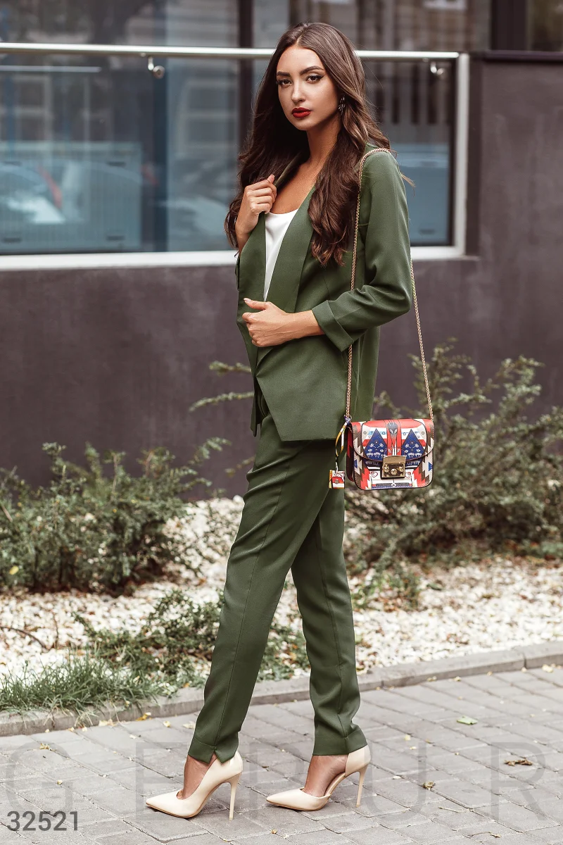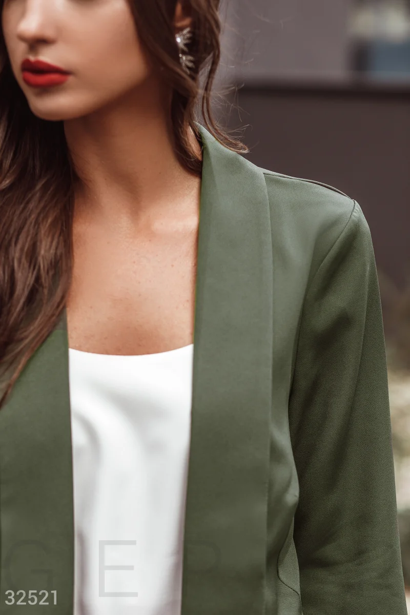 Брючный костюм-тройка темно-зеленого цвета: жакет без застежки, с шалевым воротником, рукавом 7/8 с фиксированной манжетой и карманами-обманками, расклешенный топ на широких серебристых бретелях, брюки зауженного кроя средней посадки, двумя прорезными карманами спереди и обманками сзади.